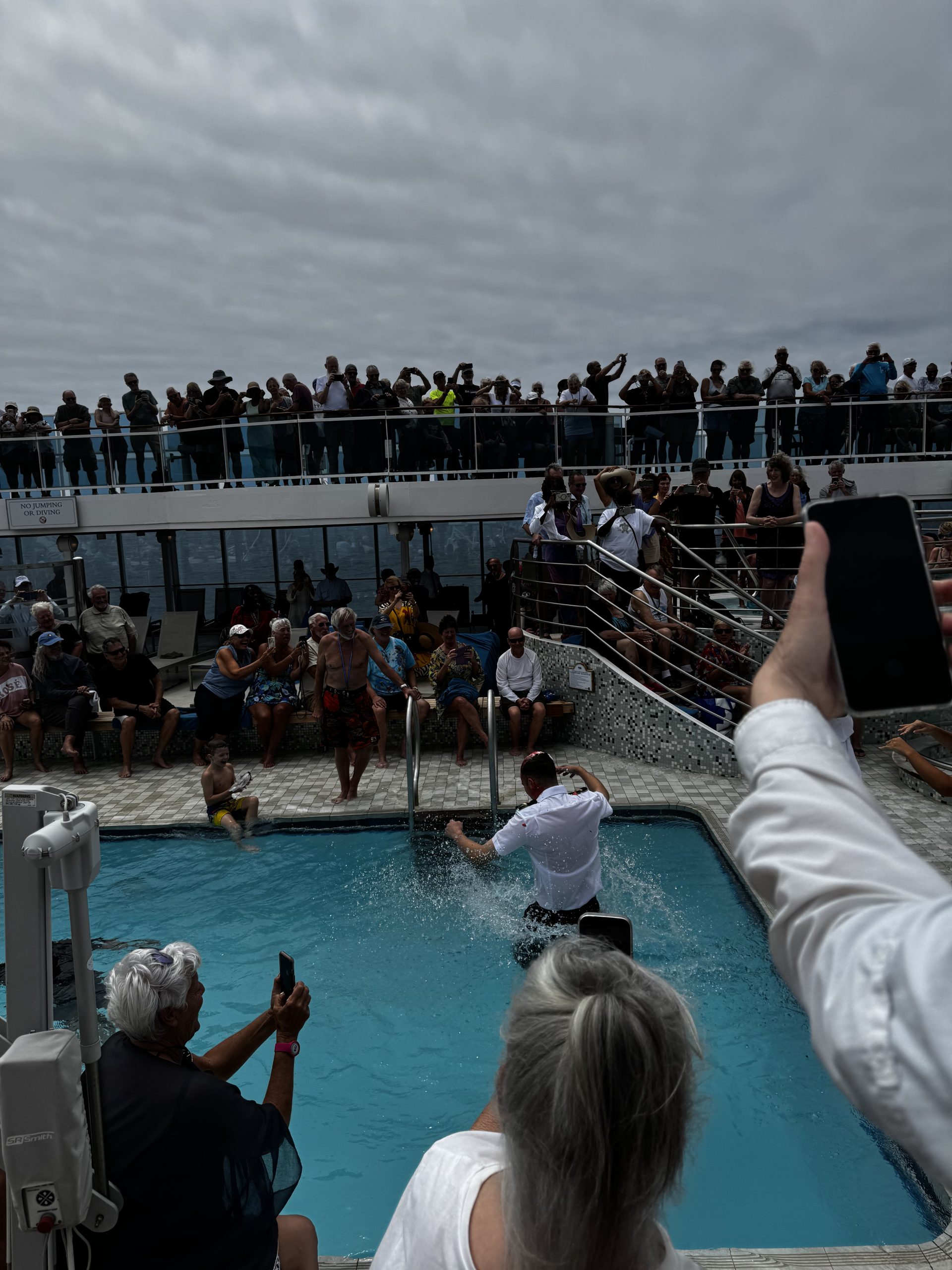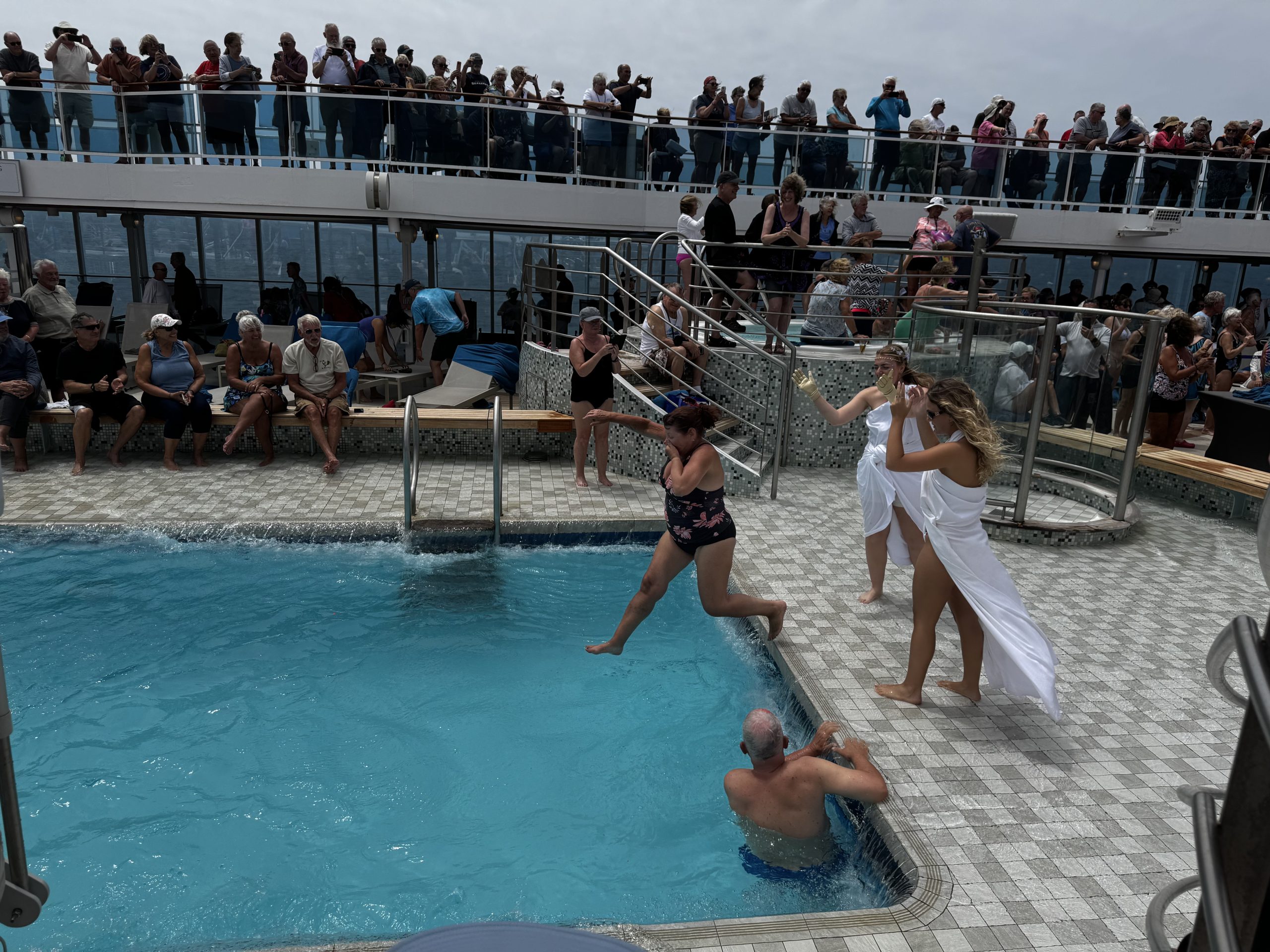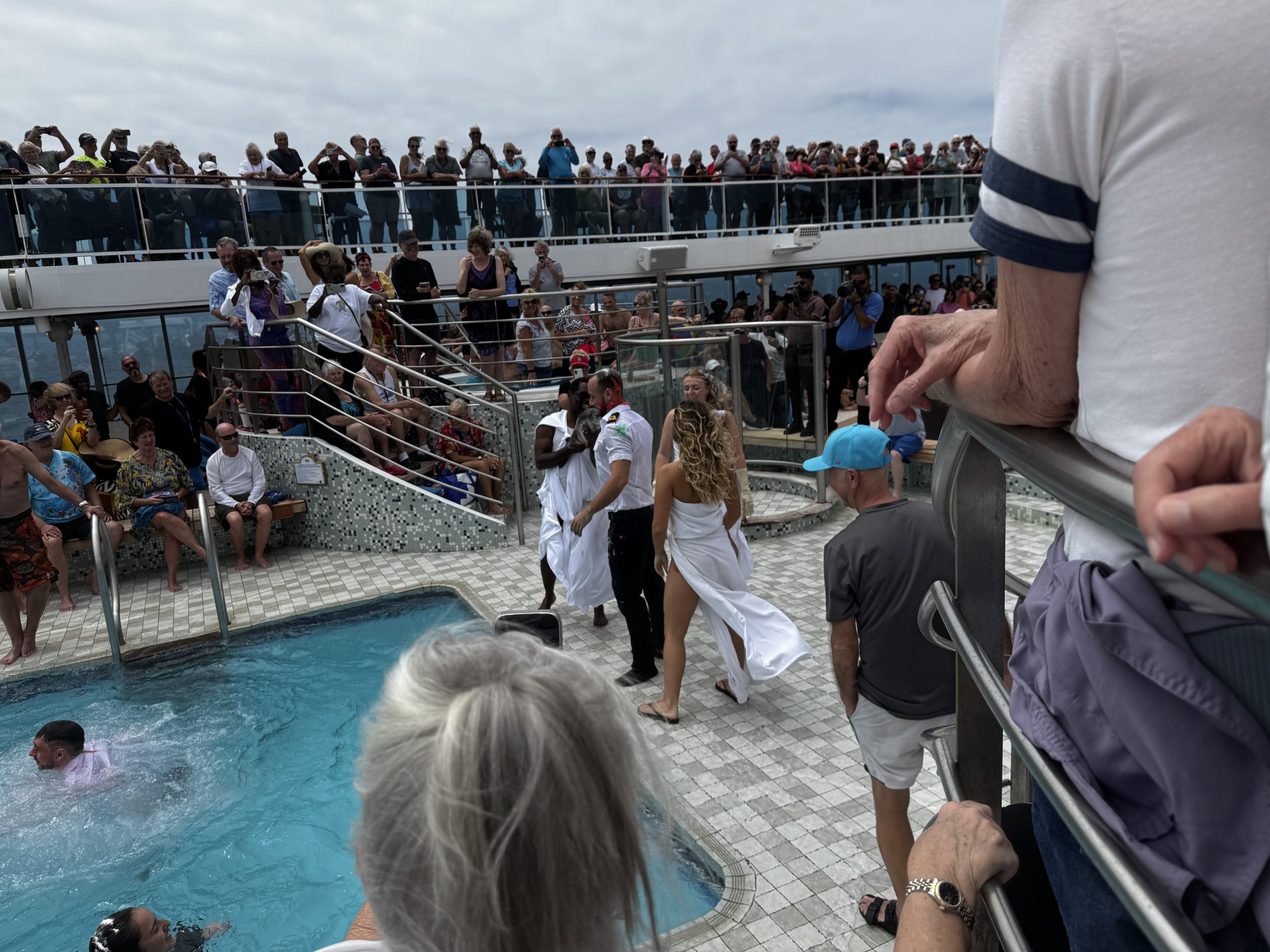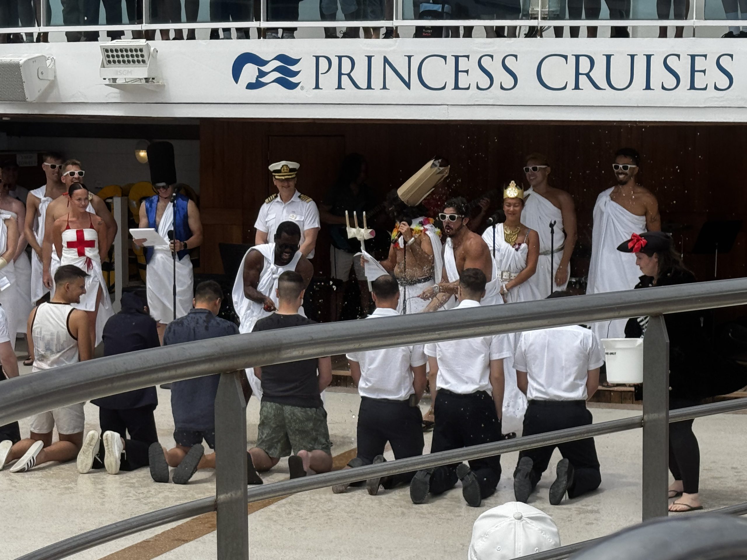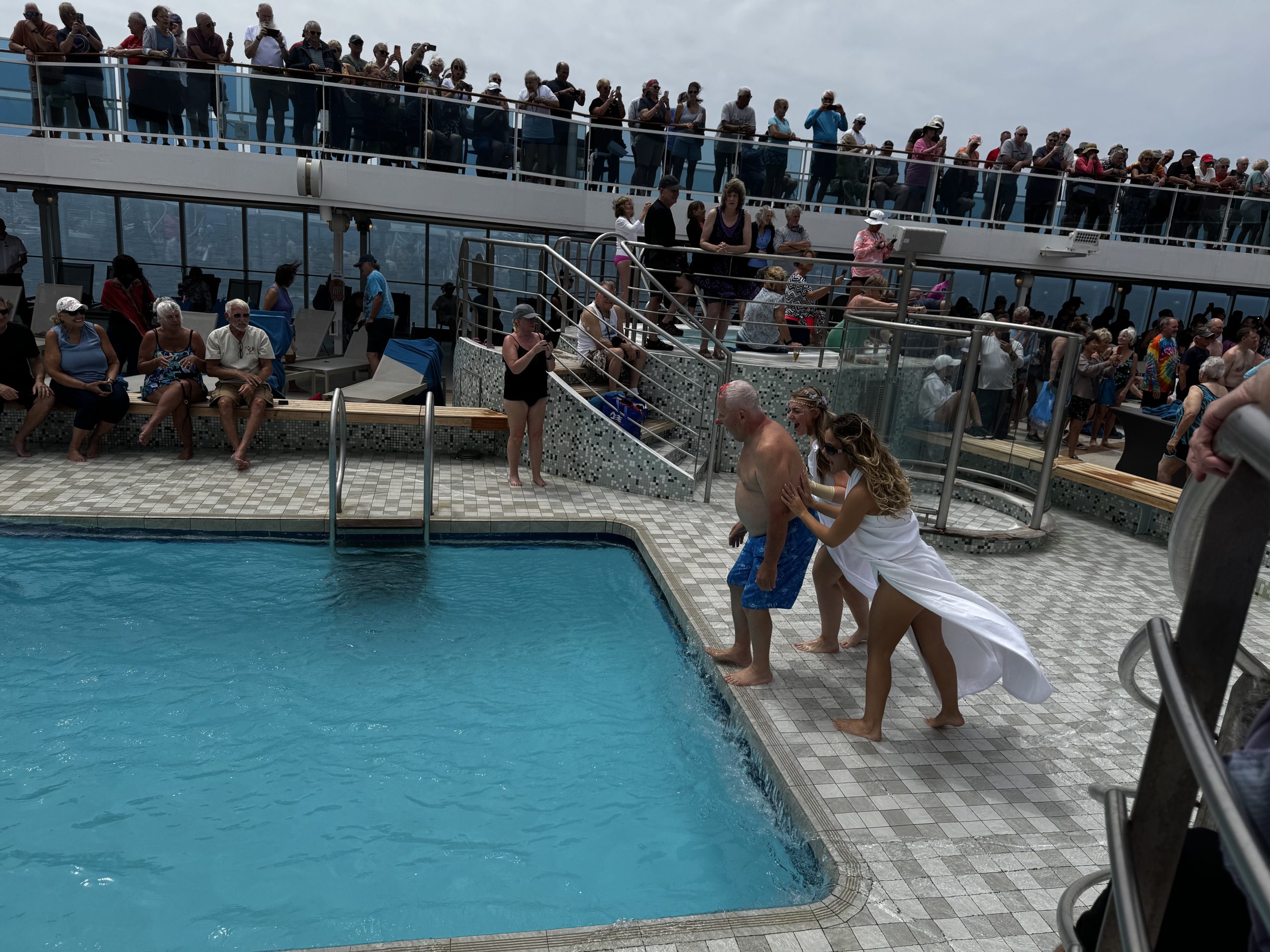This rite of passage involves a “King Neptune”, “Queen Amphitrite” and their court, based on Greek mythological characters. They proclaim that the uninitiated sailors, the “Pollywogs”, must prove their worth through a series of challenges, performed in front of those that are already Shellbacks. Today’s challenges were being drenched in ice water, covered in colorful goop, and then kissing a dead fish before going into the pool, with their uniforms on, no less. After the crew initiation, they offered for any passenger to take the challenge to “earn” their Shellback status. There were many who participated and it was all in good fun.