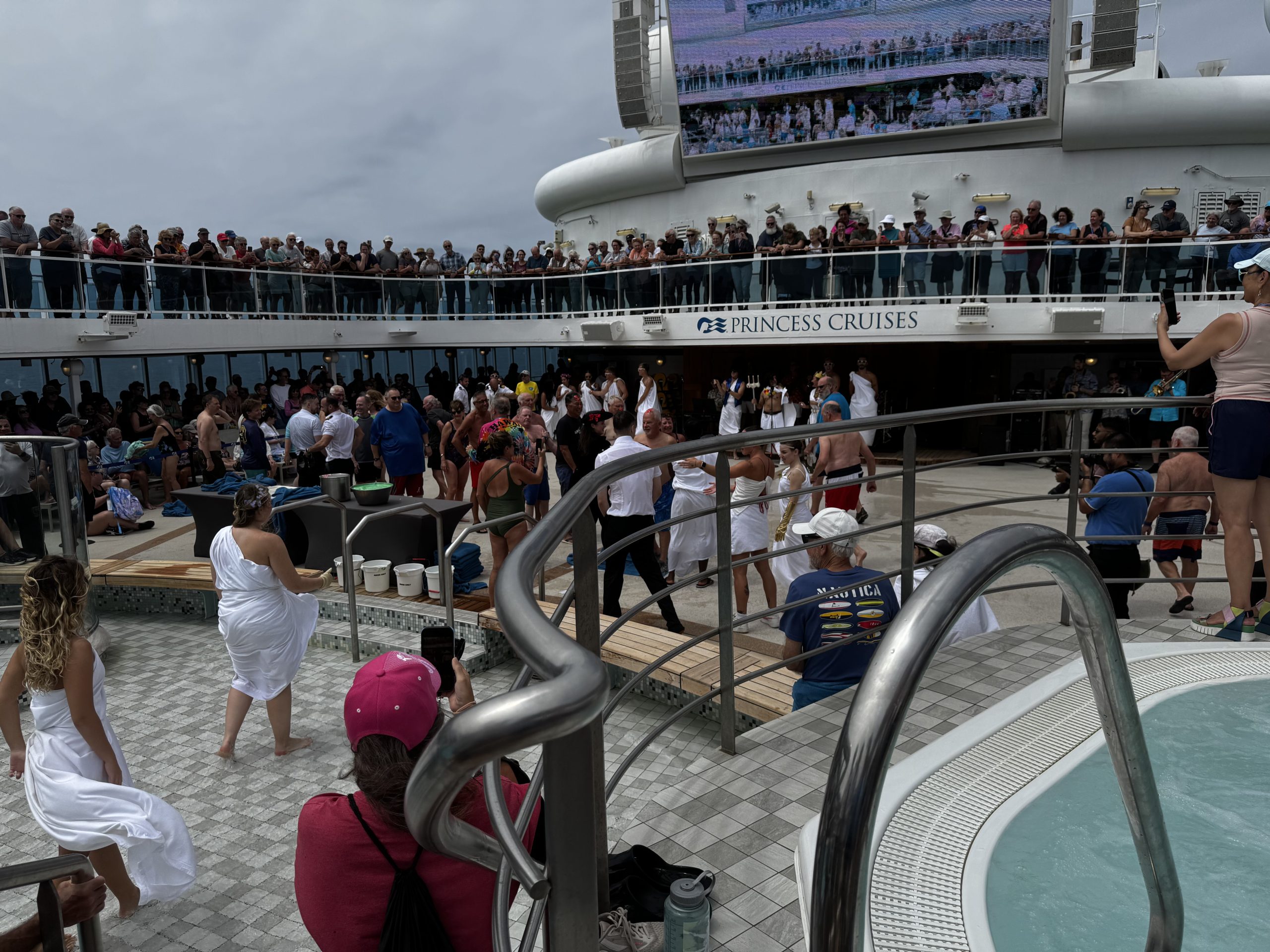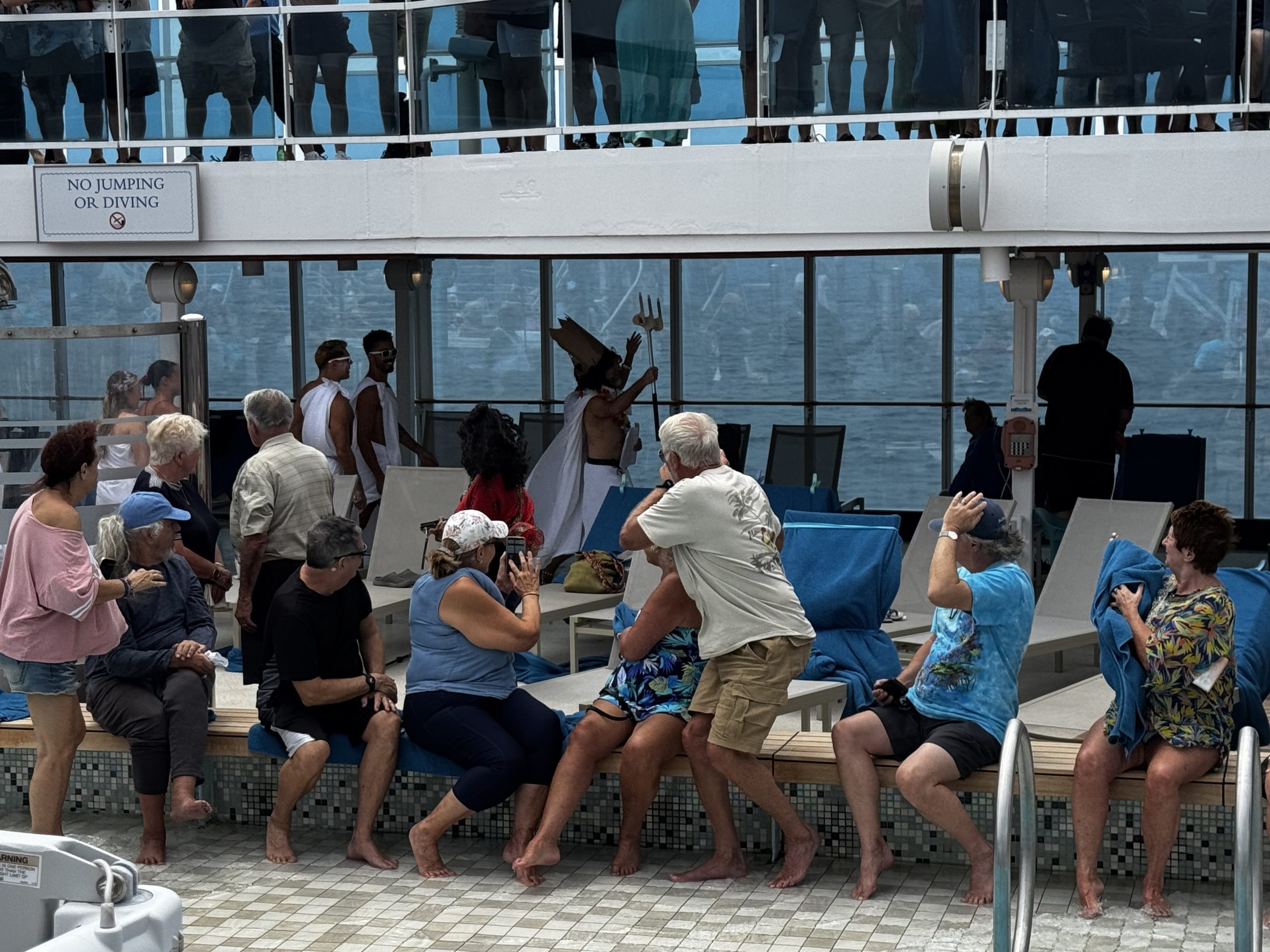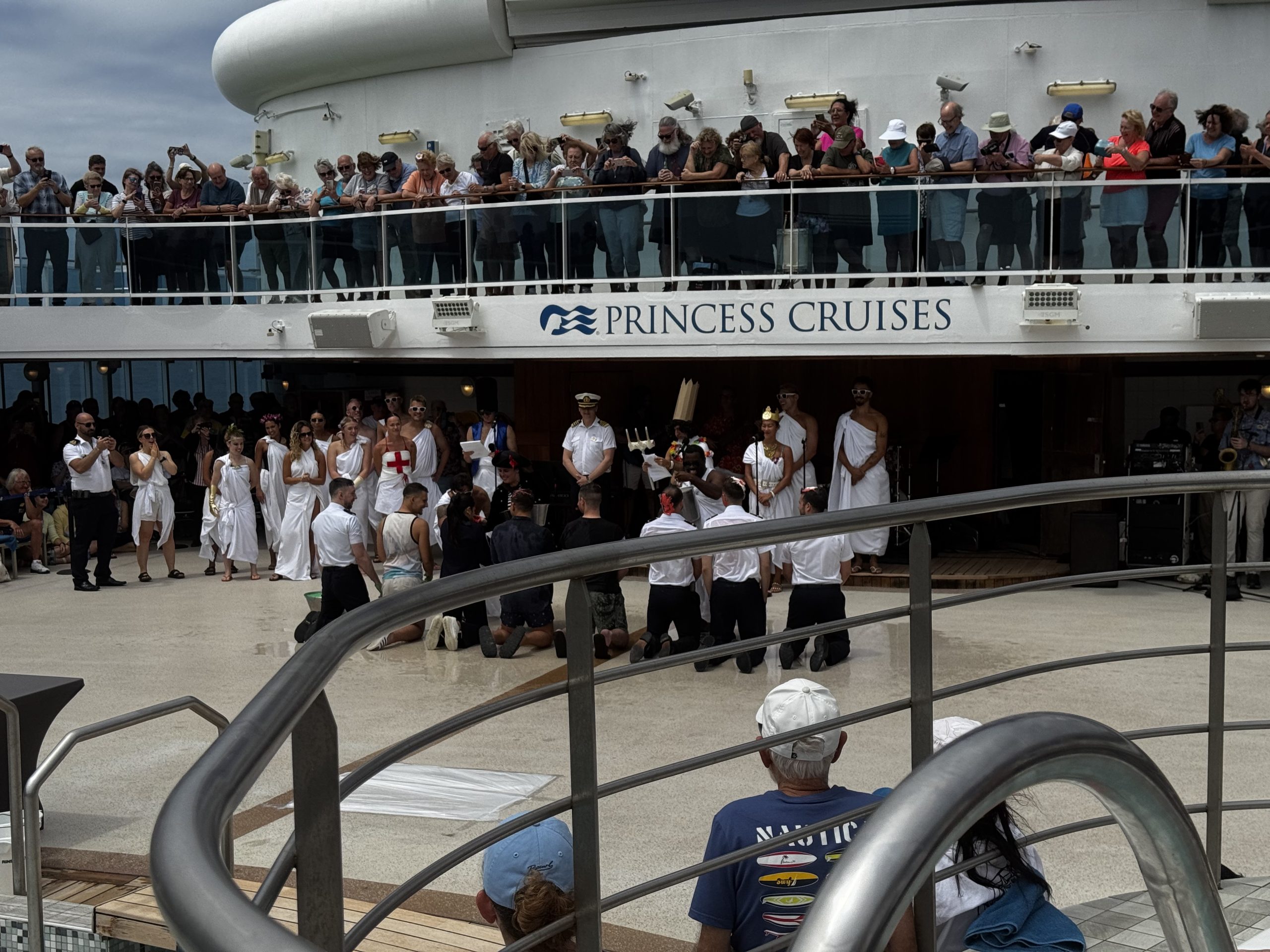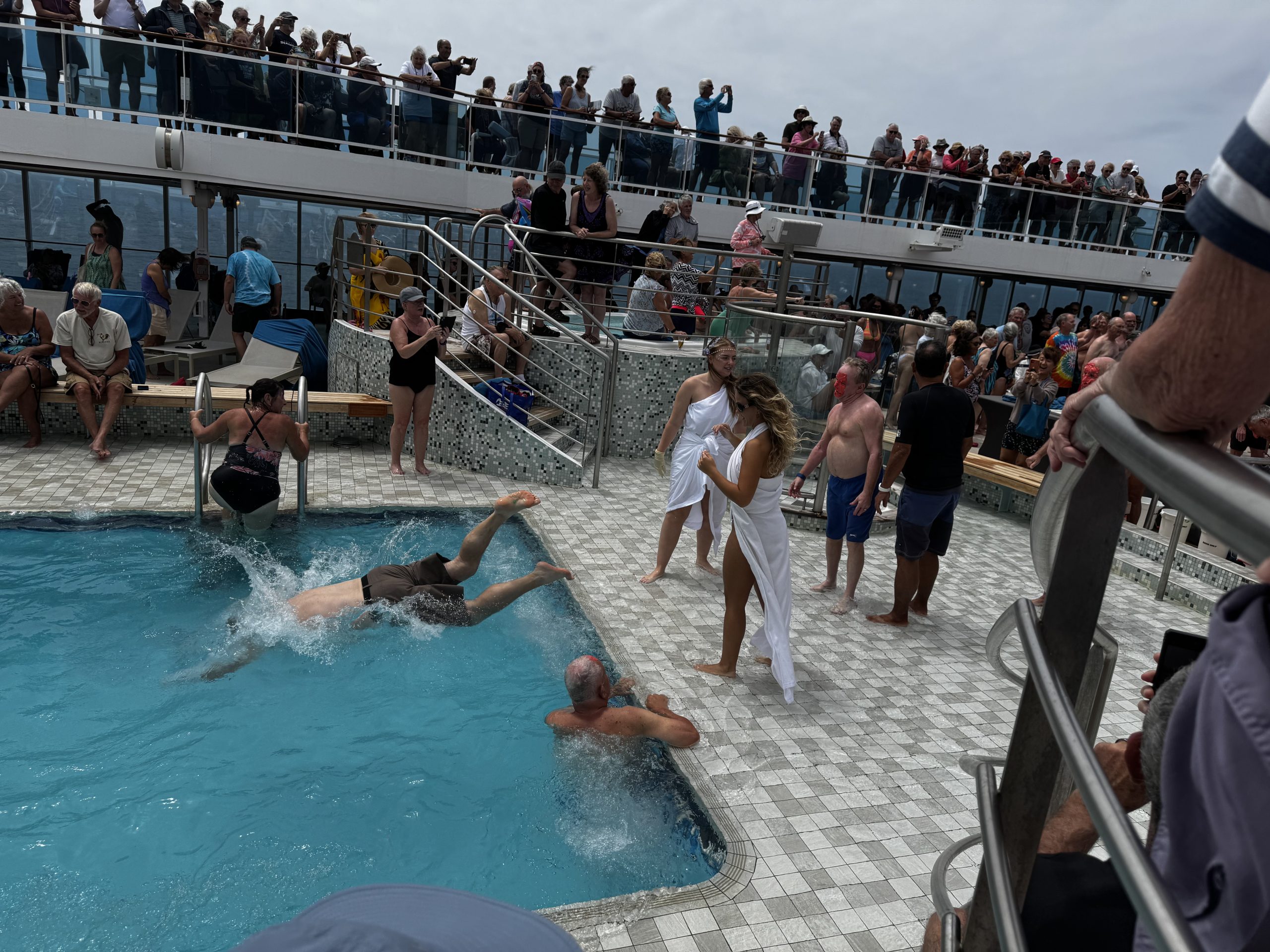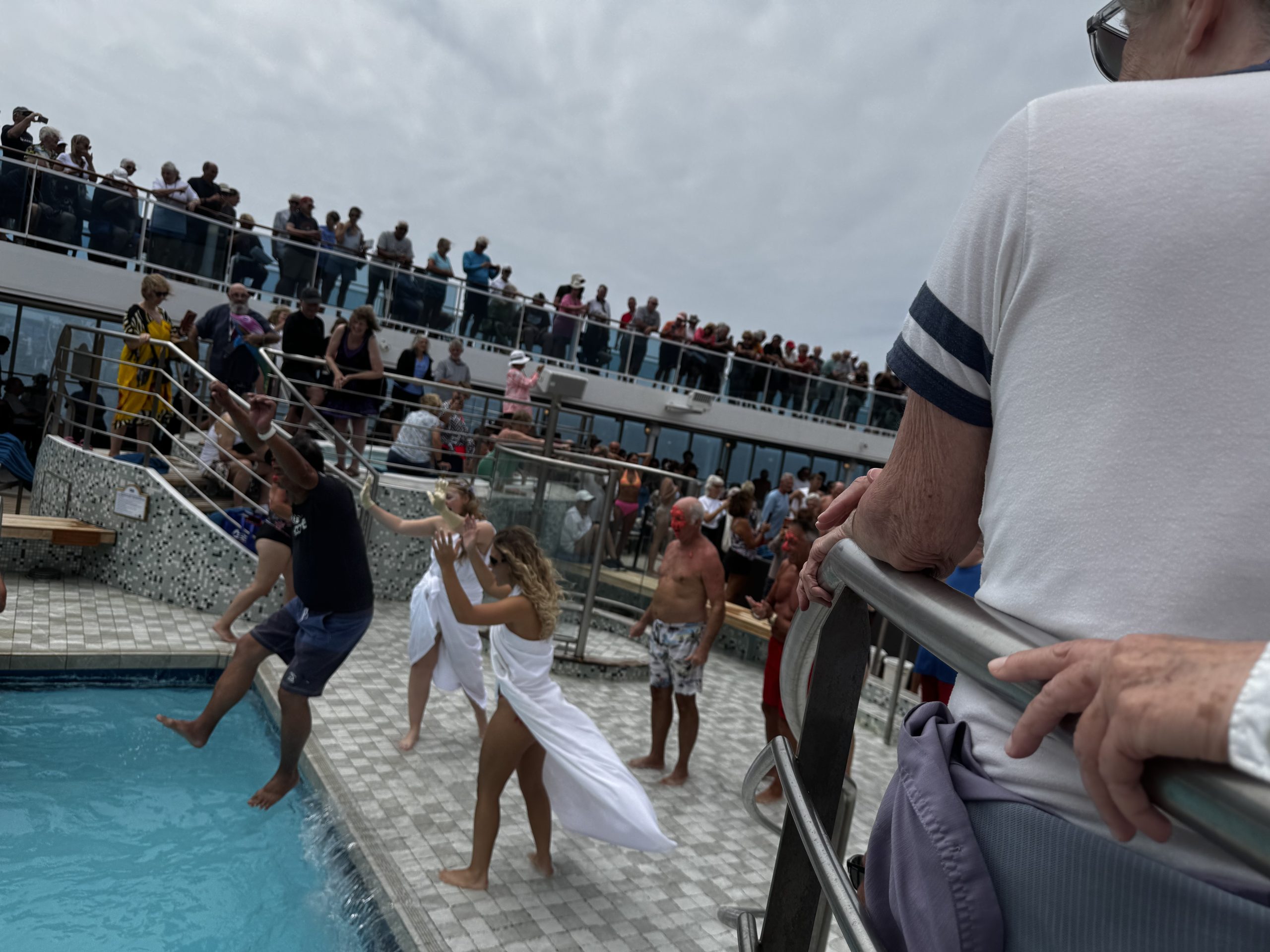 This rite of passage involves a “King Neptune”, “Queen Amphitrite” and their court, based on Greek mythological characters. They proclaim that the uninitiated sailors, the “Pollywogs”, must prove their worth through a series of challenges, performed in front of those that are already Shellbacks. Today’s challenges were being drenched in ice water, covered in colorful goop, and then kissing a dead fish before going into the pool, with their uniforms on, no less. After the crew initiation, they offered for any passenger to take the challenge to “earn” their Shellback status. There were many who participated and it was all in good fun.