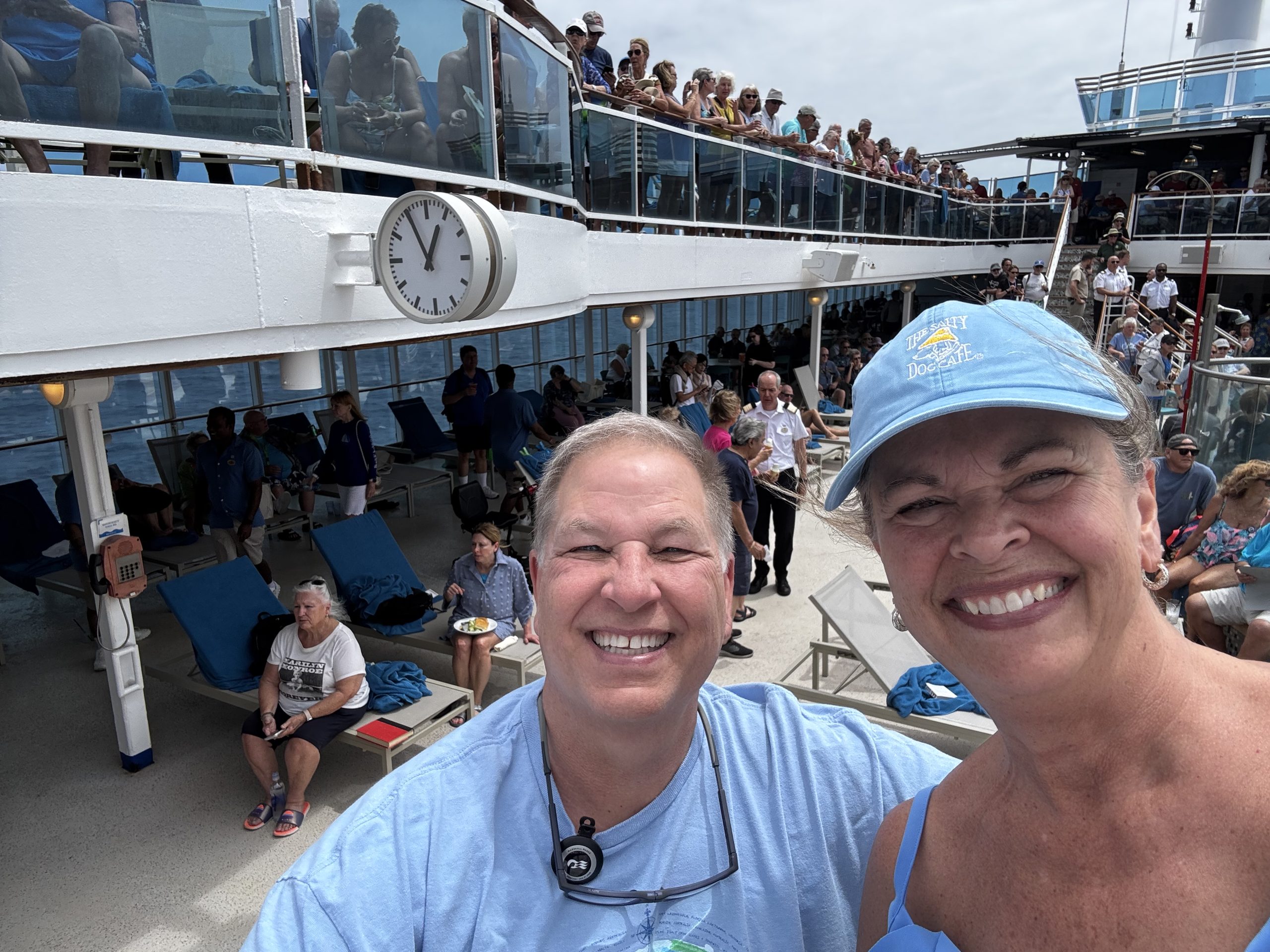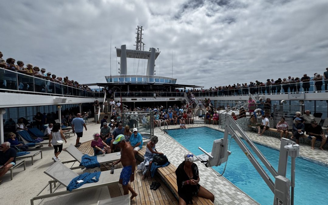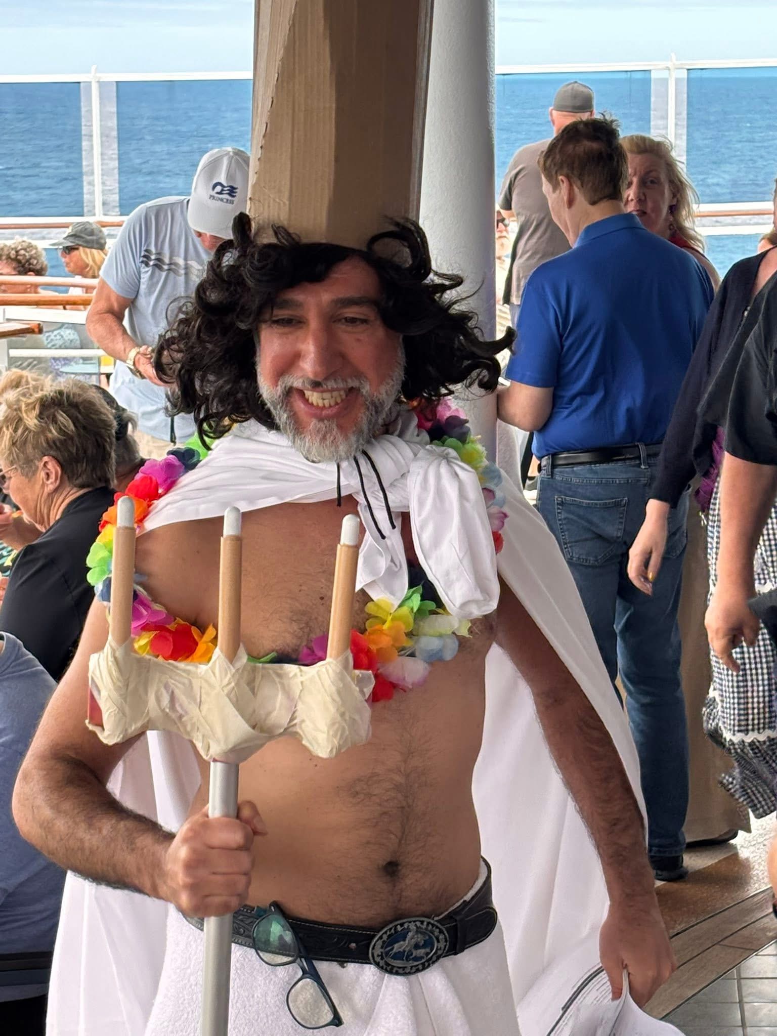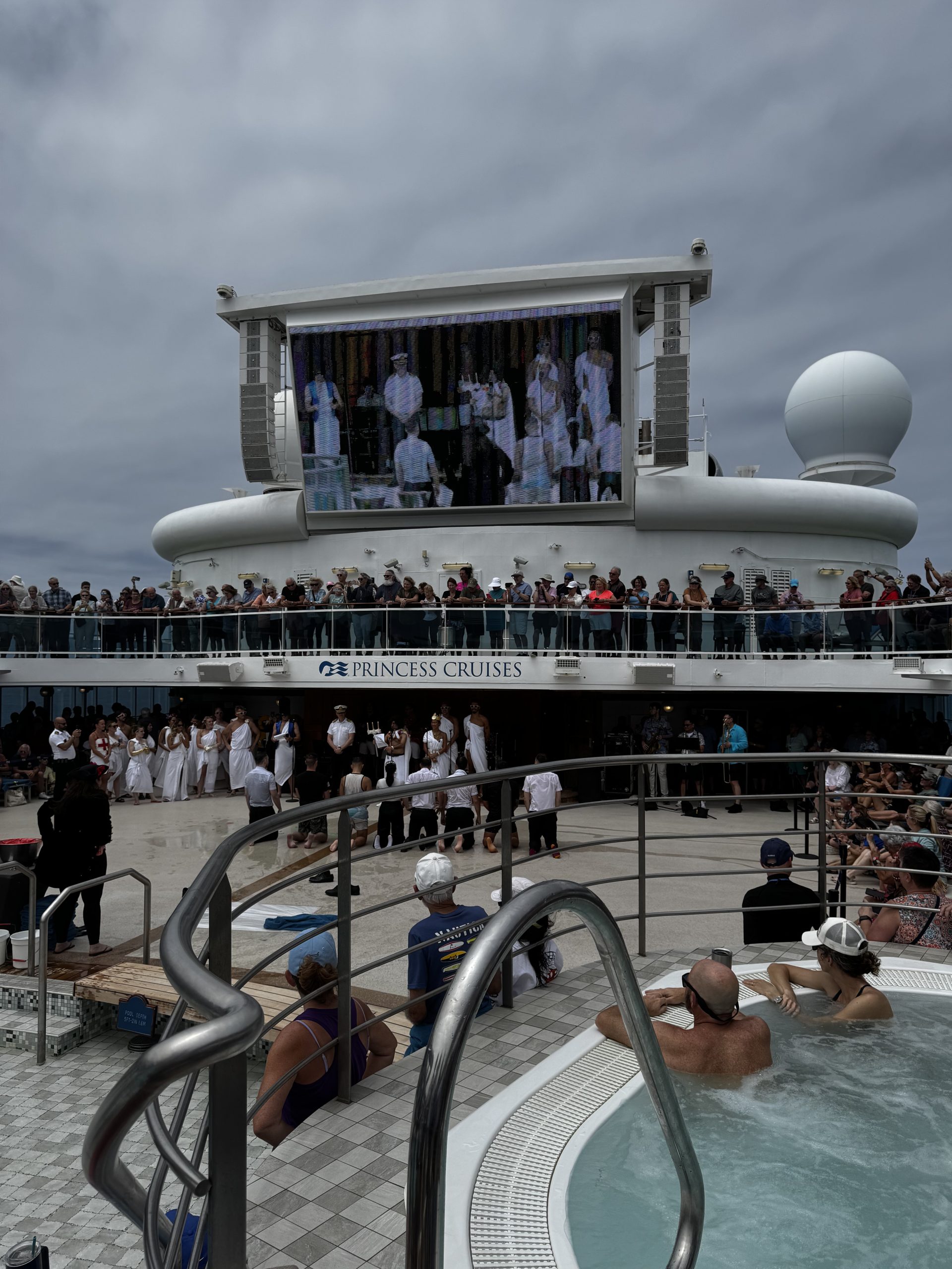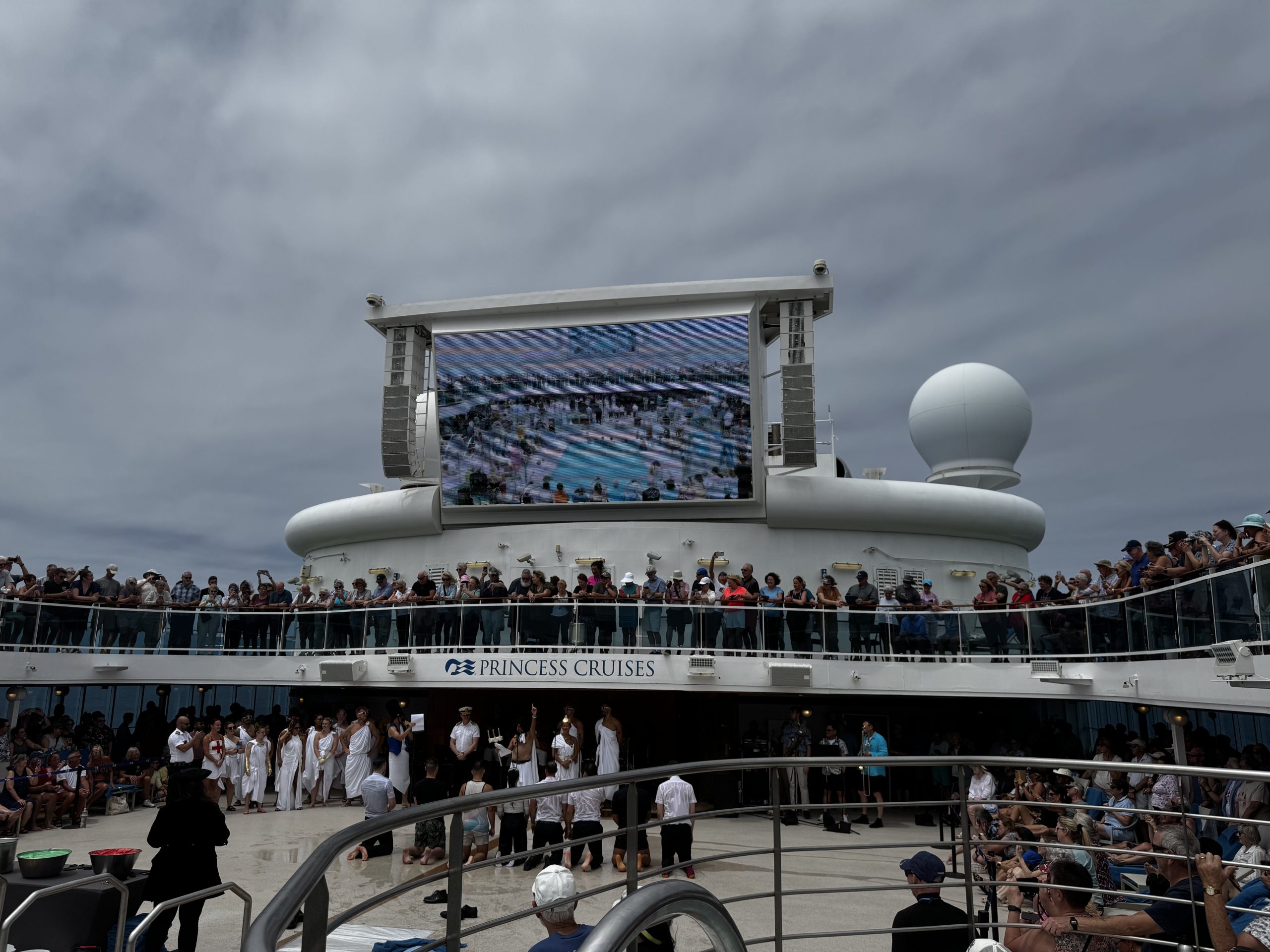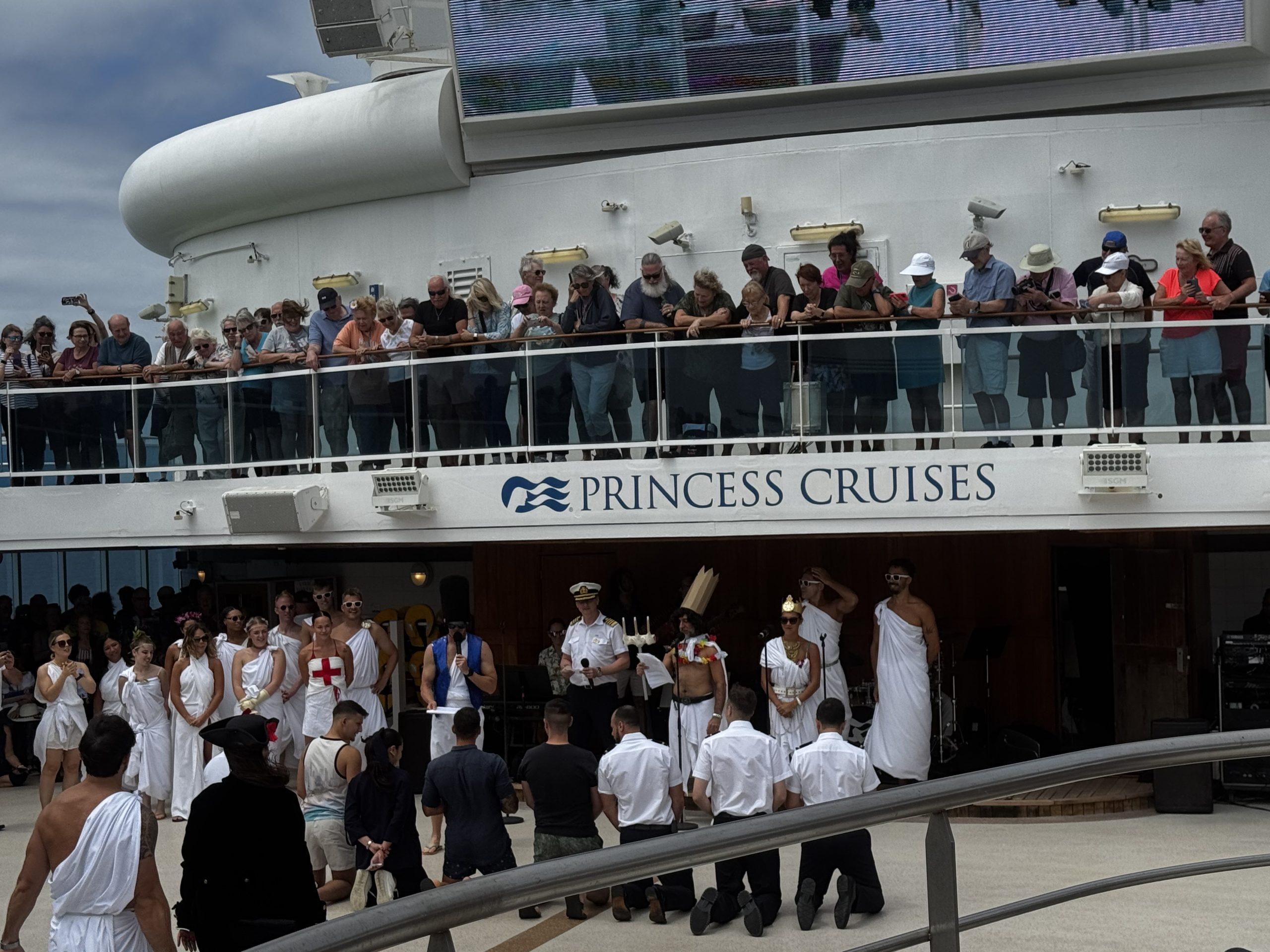 This rite of passage involves a “King Neptune”, “Queen Amphitrite” and their court, based on Greek mythological characters. They proclaim that the uninitiated sailors, the “Pollywogs”, must prove their worth through a series of challenges, performed in front of those that are already Shellbacks. Today’s challenges were being drenched in ice water, covered in colorful goop, and then kissing a dead fish before going into the pool, with their uniforms on, no less. After the crew initiation, they offered for any passenger to take the challenge to “earn” their Shellback status. There were many who participated and it was all in good fun.