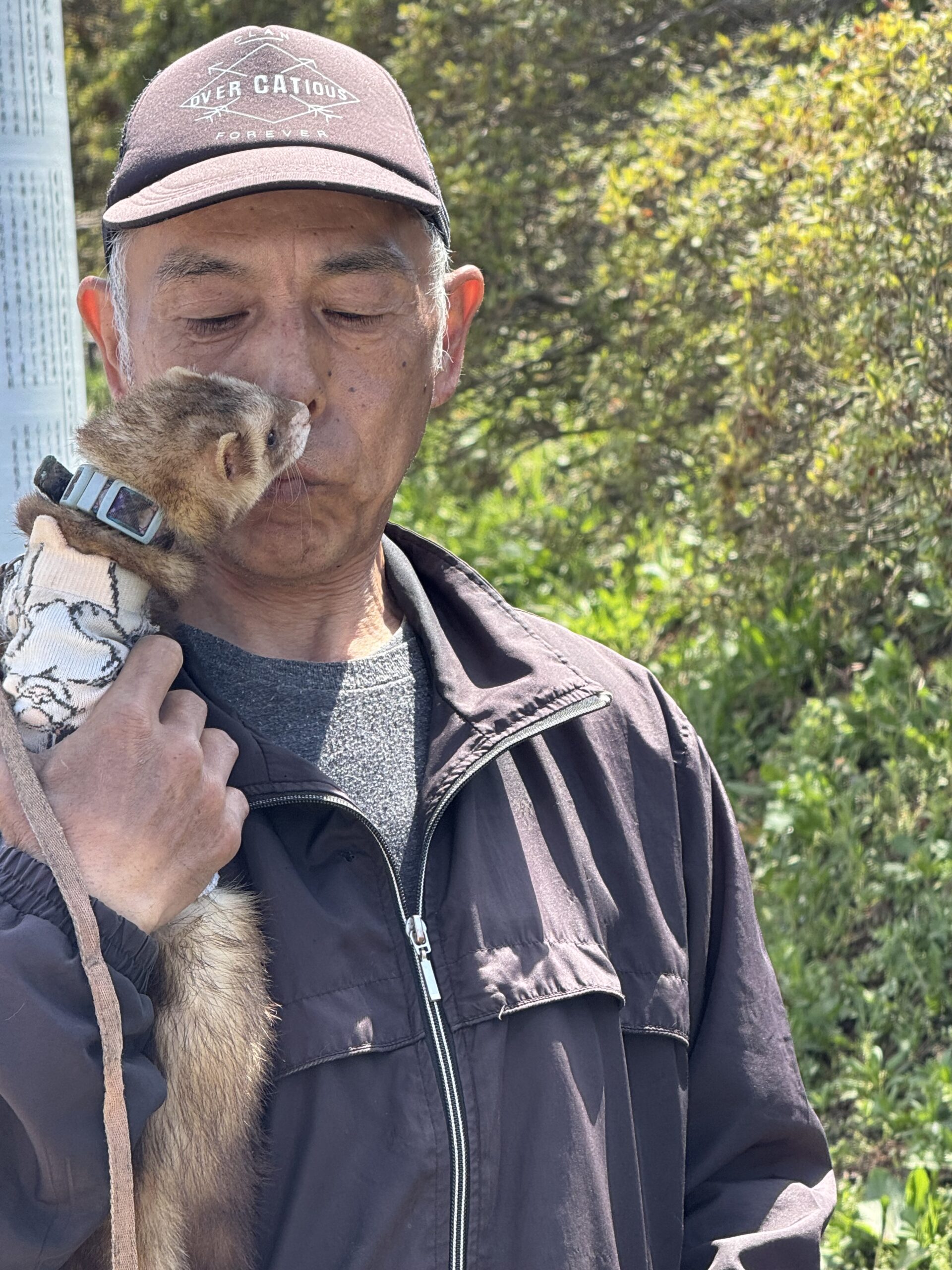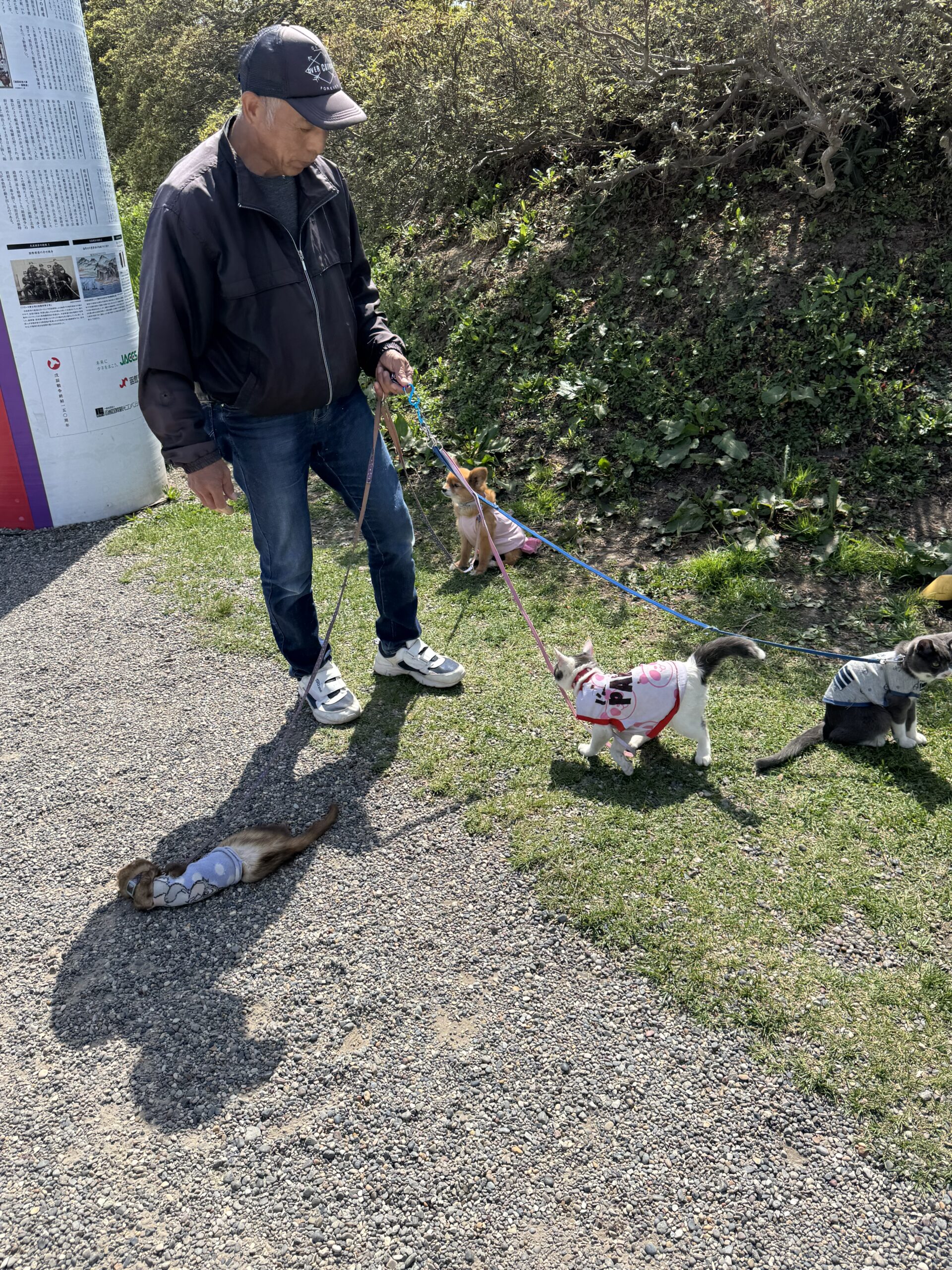 A man, walking his dog, two cats and a ferret.