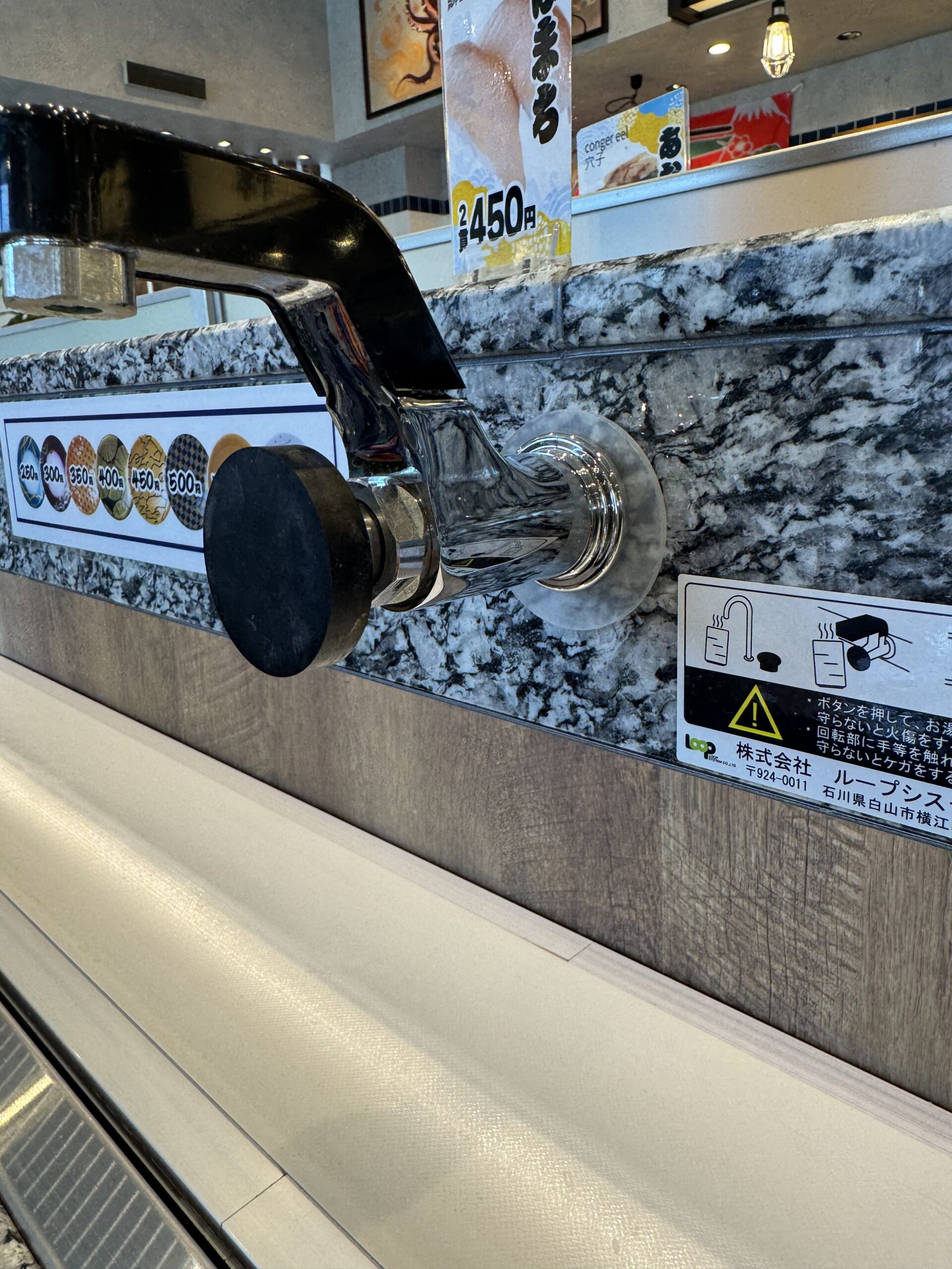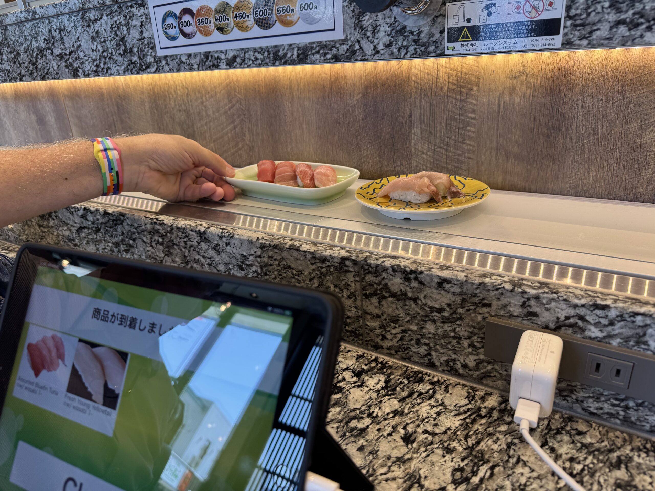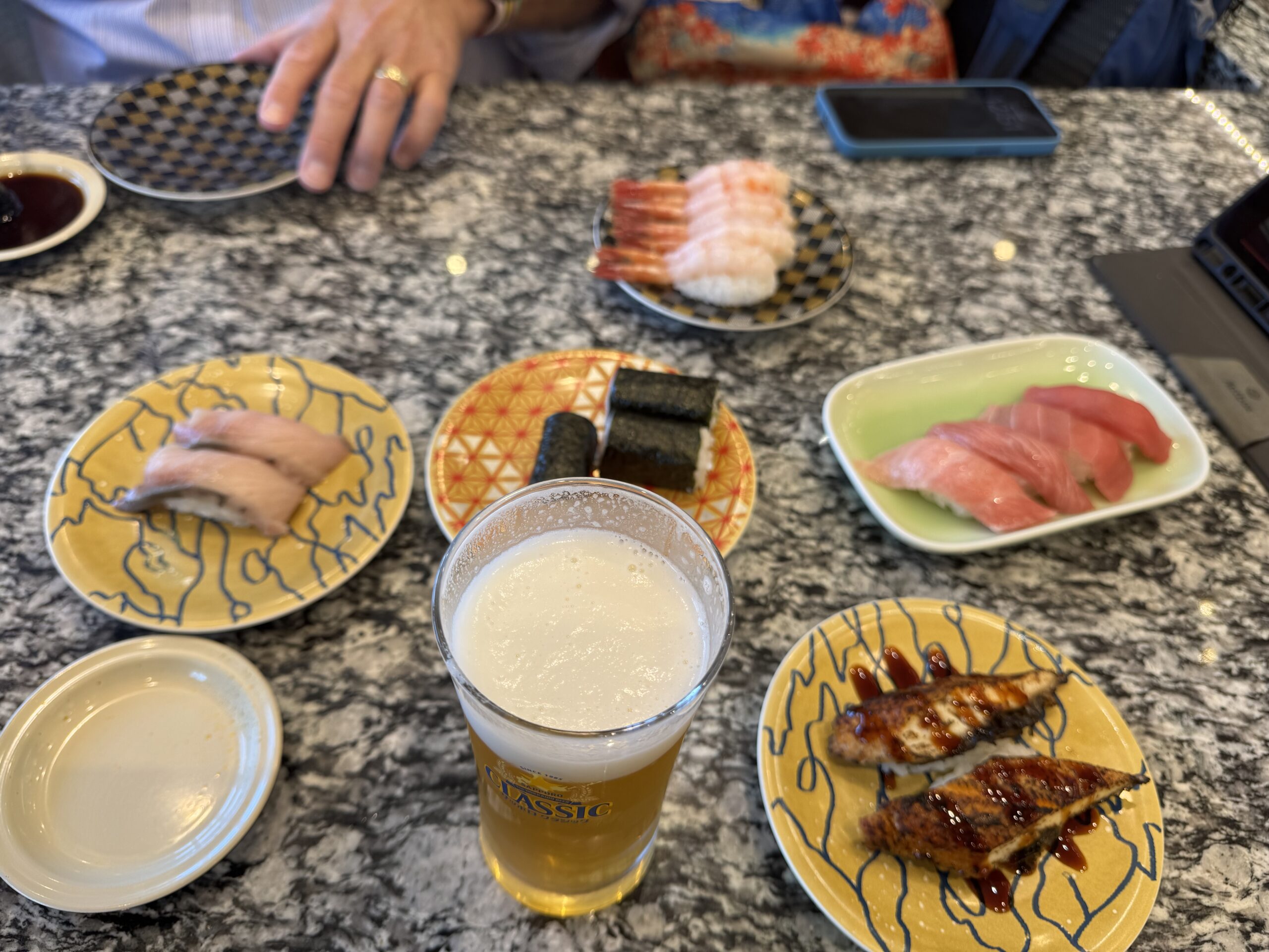 Afterwards, we enjoyed sushi at a local conveyor belt restaurant, Marukatsu Suisan. While we’ve experienced a conveyor belt restaurant before, this one was different. You place your order of sushi items, using an ordering pad, and then your sushi gets prepared and comes to your table on the conveyor belt, stopping right in front of your table. The food is traveling so fast, you wouldn’t dare grab something that wasn’t yours. There was also a hot water spigot at each table so you could prepare your own tea. The food and the experience were both excellent.