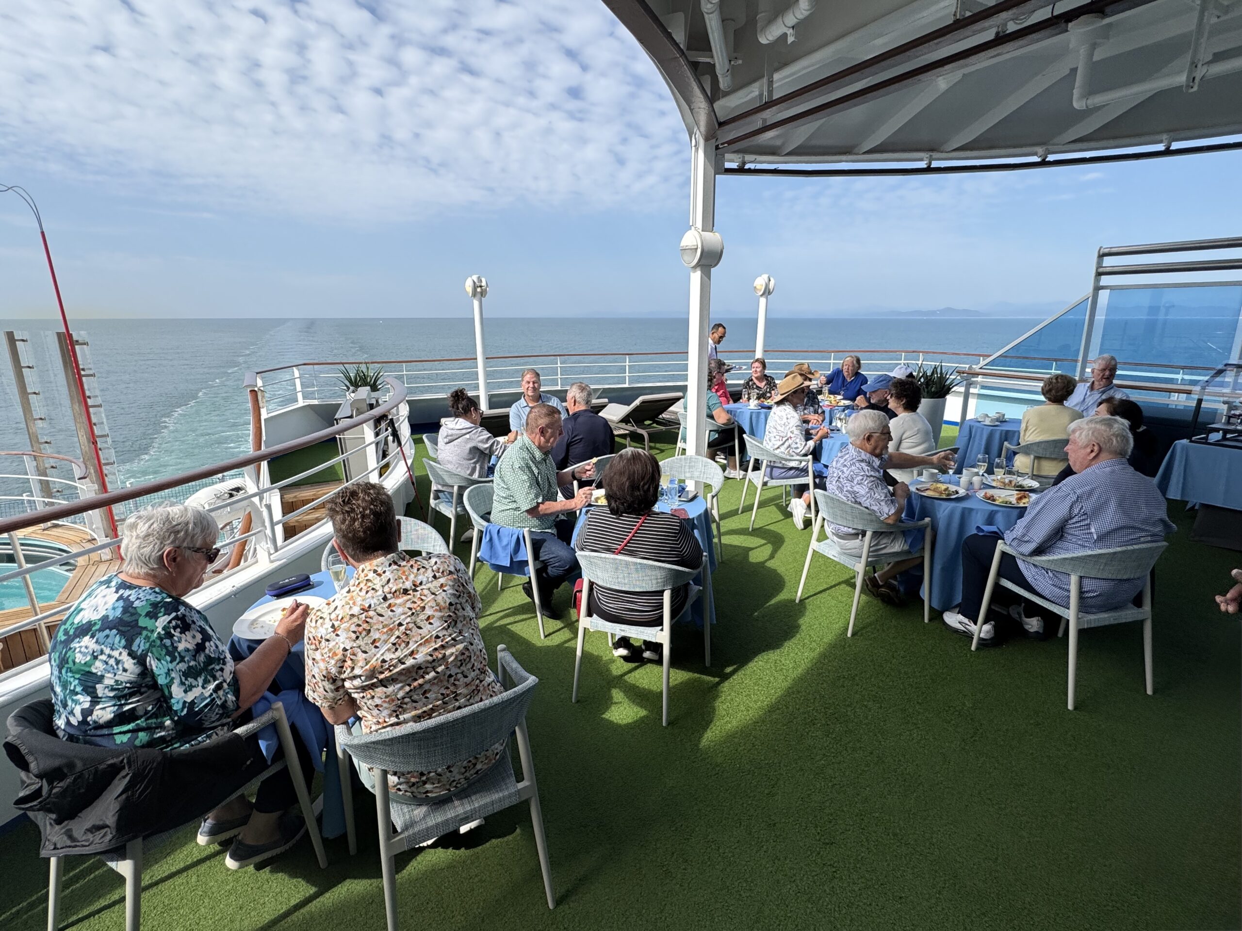 But before we made port with our scheduled late arrival into Kochi at 10am, we attended a birthday party for our new Australian travel friend, John Powell. If you remember, John and his wife, Leanne Butterworth, planned our amazing wine tour of the Barossa Valley, along with all of the ship’s sommeliers. Today, the sommeliers had planned a beautiful birthday breakfast in the ship’s sanctuary area, and we enjoyed the sail-in to port.