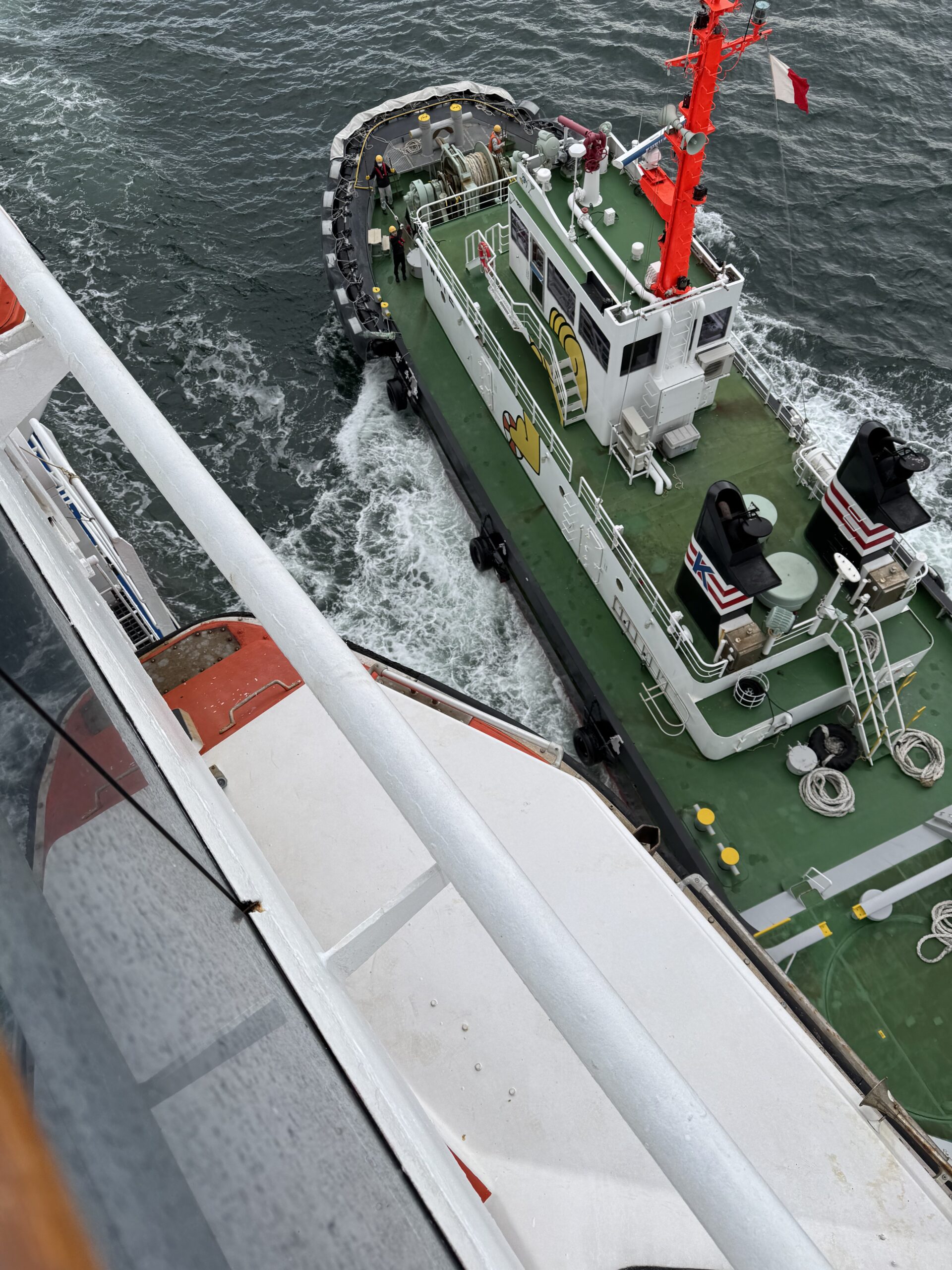 The ship on the other side of the new and old tsunami wall.