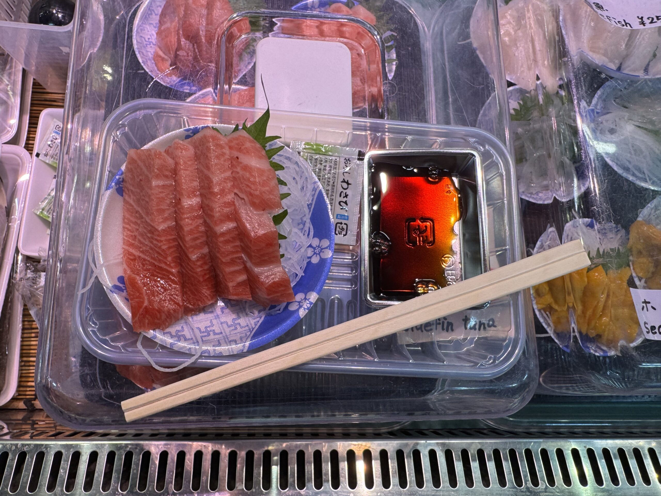 Our next stop was the fish market in town, where we found a welcome sign for the ship. This was a lively shopping stop for locals and tourists alike. Sharon sampled some Otoro tuna while Marshall enjoyed some sweets. There were some really unusual varieties of shellfish, seaweed and fish being sold. The market also has a regular grocery store attached, and there were some small stalls selling souvenirs and home goods. The Japanese people were so friendly. As Sharon sat at a table, eating her tuna, several older Japanese seniors came up and nodded and smiled their approval.