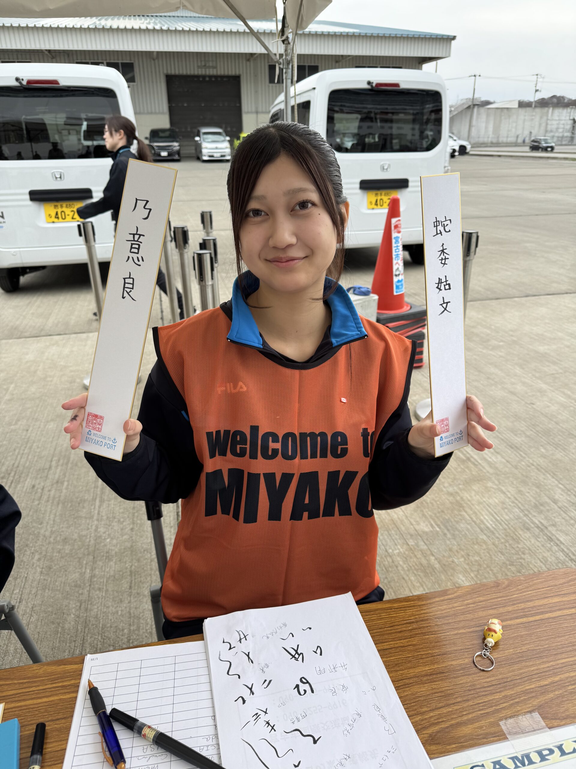 The real star of the shopping opportunities though came after the completion of our tour. As we were pulling back up to the ship, we couldn’t believe what had been set up since we left the ship three hours prior. Now there were food trucks, and a large tent with tables and chairs. There were dignitaries with flowers and flag bearers. There were 20 or more stalls selling beautiful handcrafted items like kimonos, Japanese papers, purses, jewelry, slippers, and more. There were school girls inscribing names with Japanese letters, on beautiful cards – for free!!