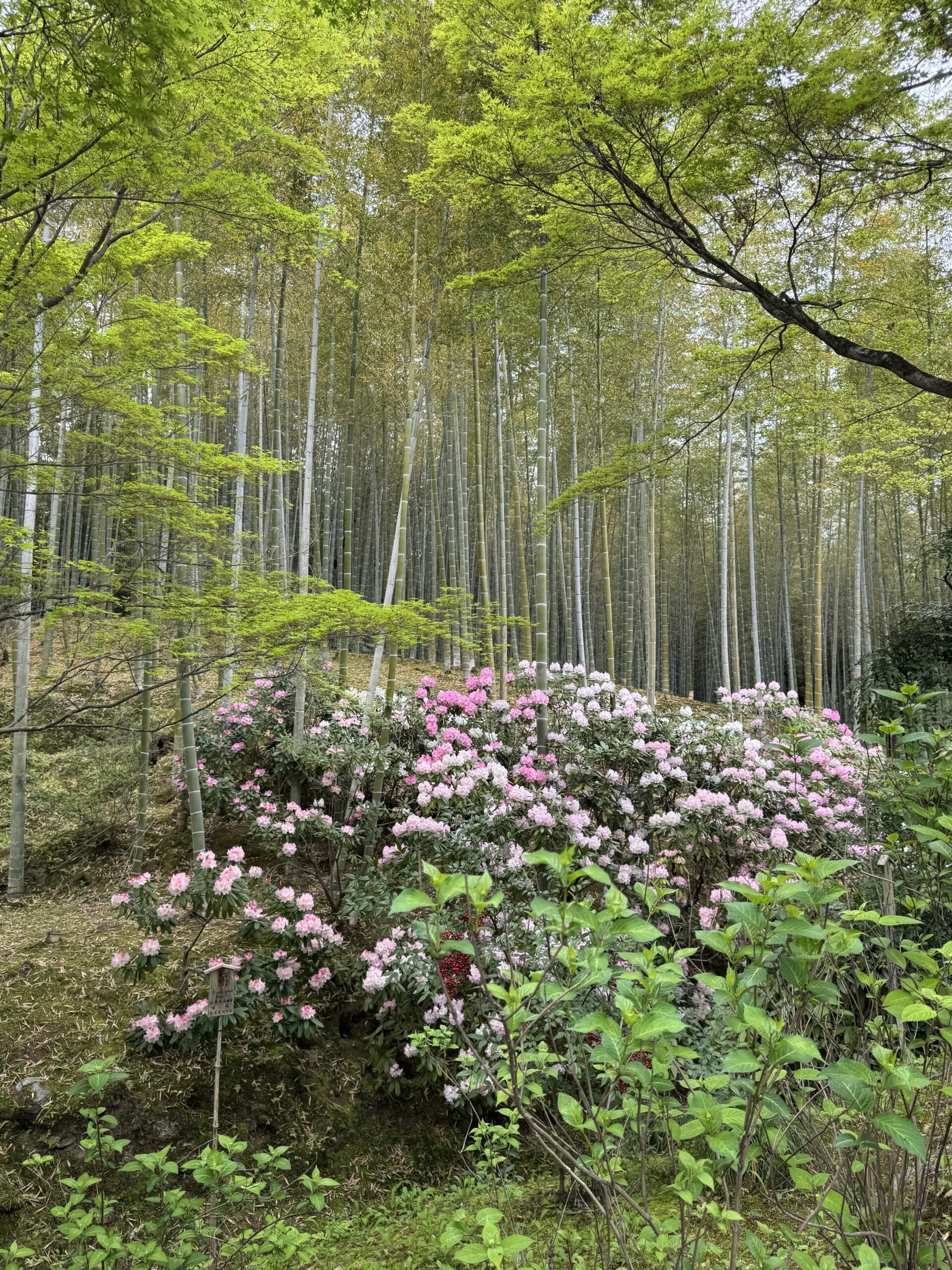 After lunch, we visited Arashiyama and the Bamboo Forest. Tenryu-ji Temple is the headline attraction in Arashiyama, a sprawling Zen temple with one of the finest gardens in Kyoto and wonderful mountain views. We walked through the gorgeous gardens on our way to the Bamboo Forest. Though there were way too many people, the azaleas, rhododendron and cherry blossoms were on full display, in front of the bamboo. There is a fairly daunting elevation change getting into the forest but once there, it is magical. This spot has been on Sharon’s bucket list for years and it did not disappoint.