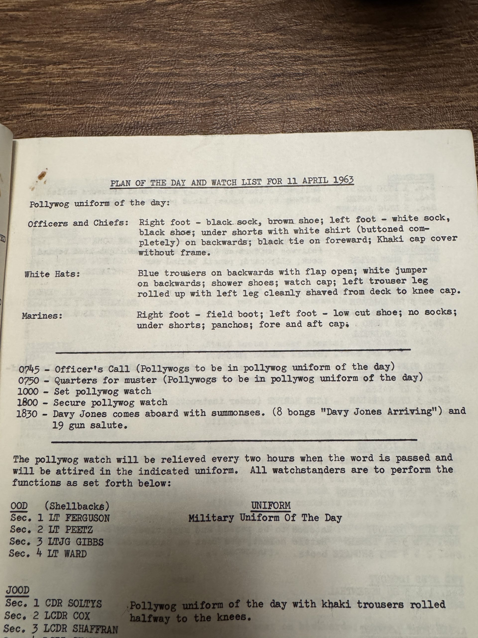 Notice the description of the Pollywog uniform for the day; not exactly standard issue!