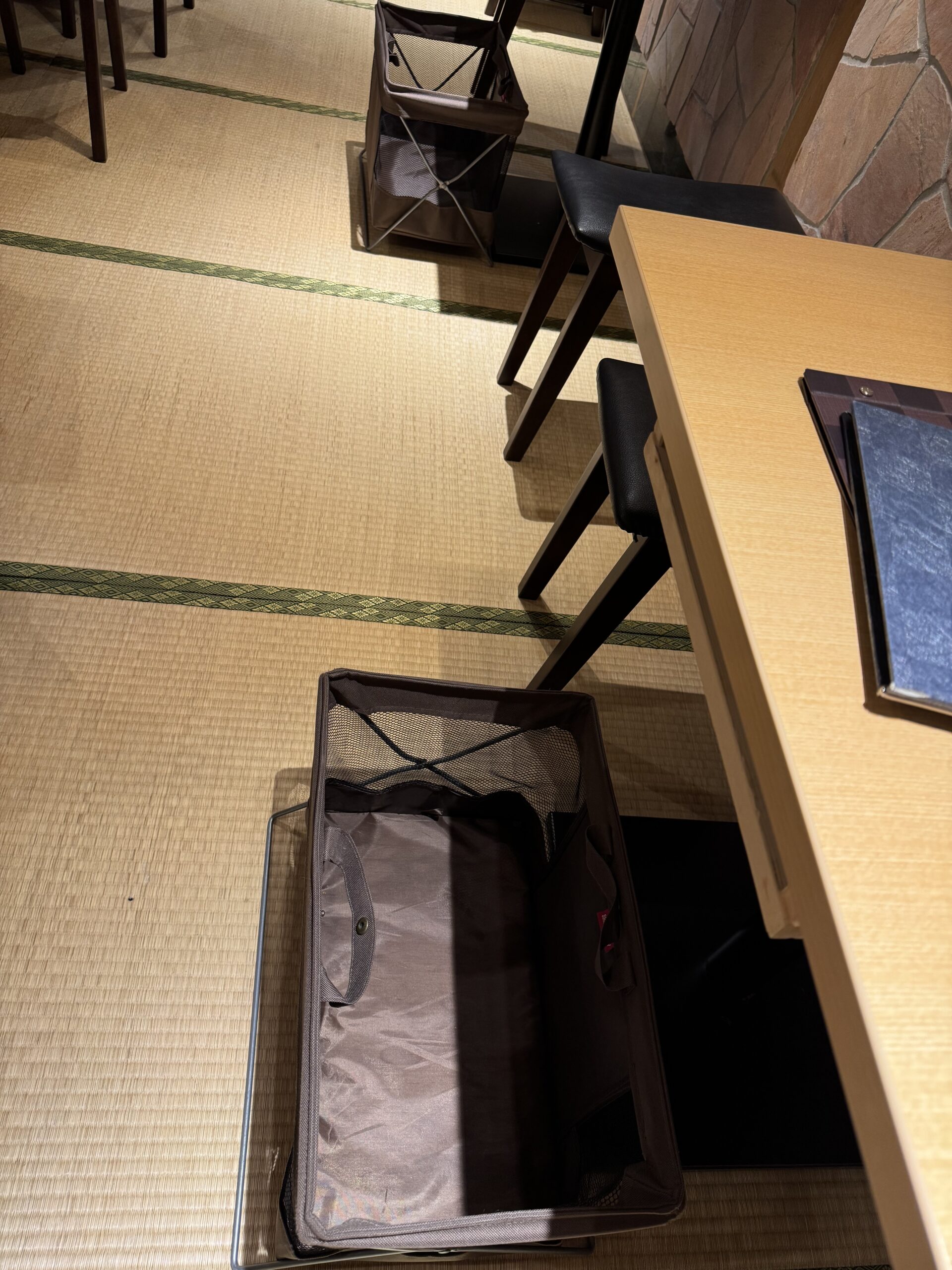 In Japan, it is rude to put purses or bags on the table top so they provide a basket at the end of each table.