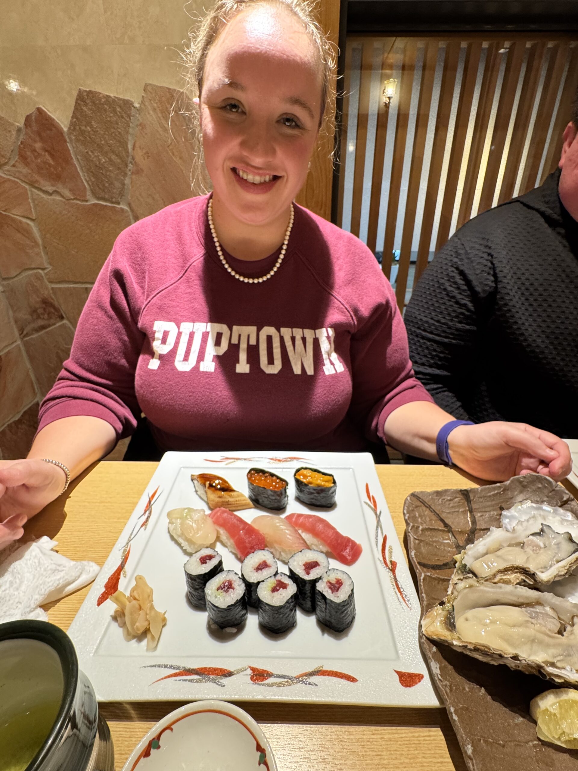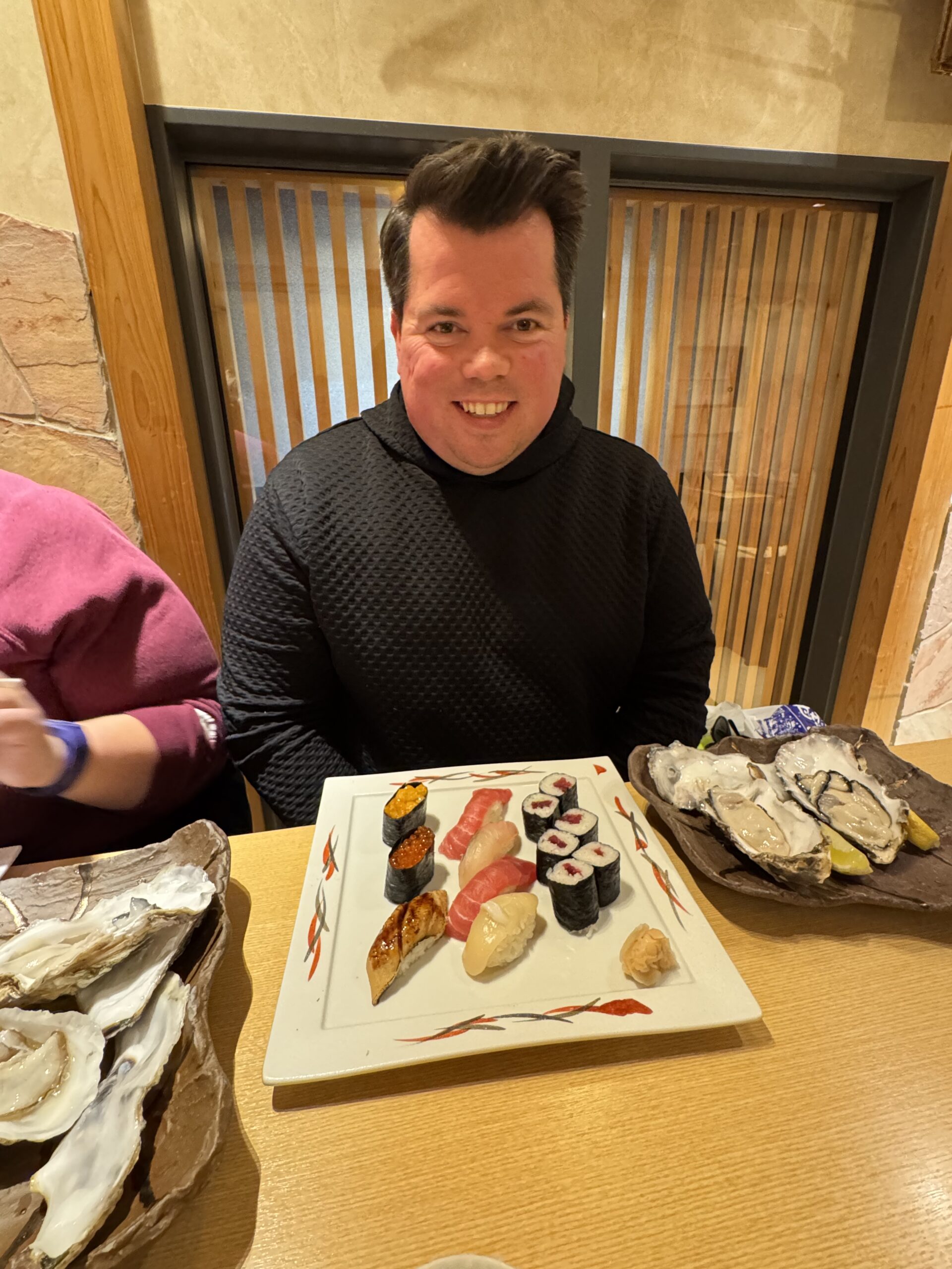 Happy clan eating on their sushi.