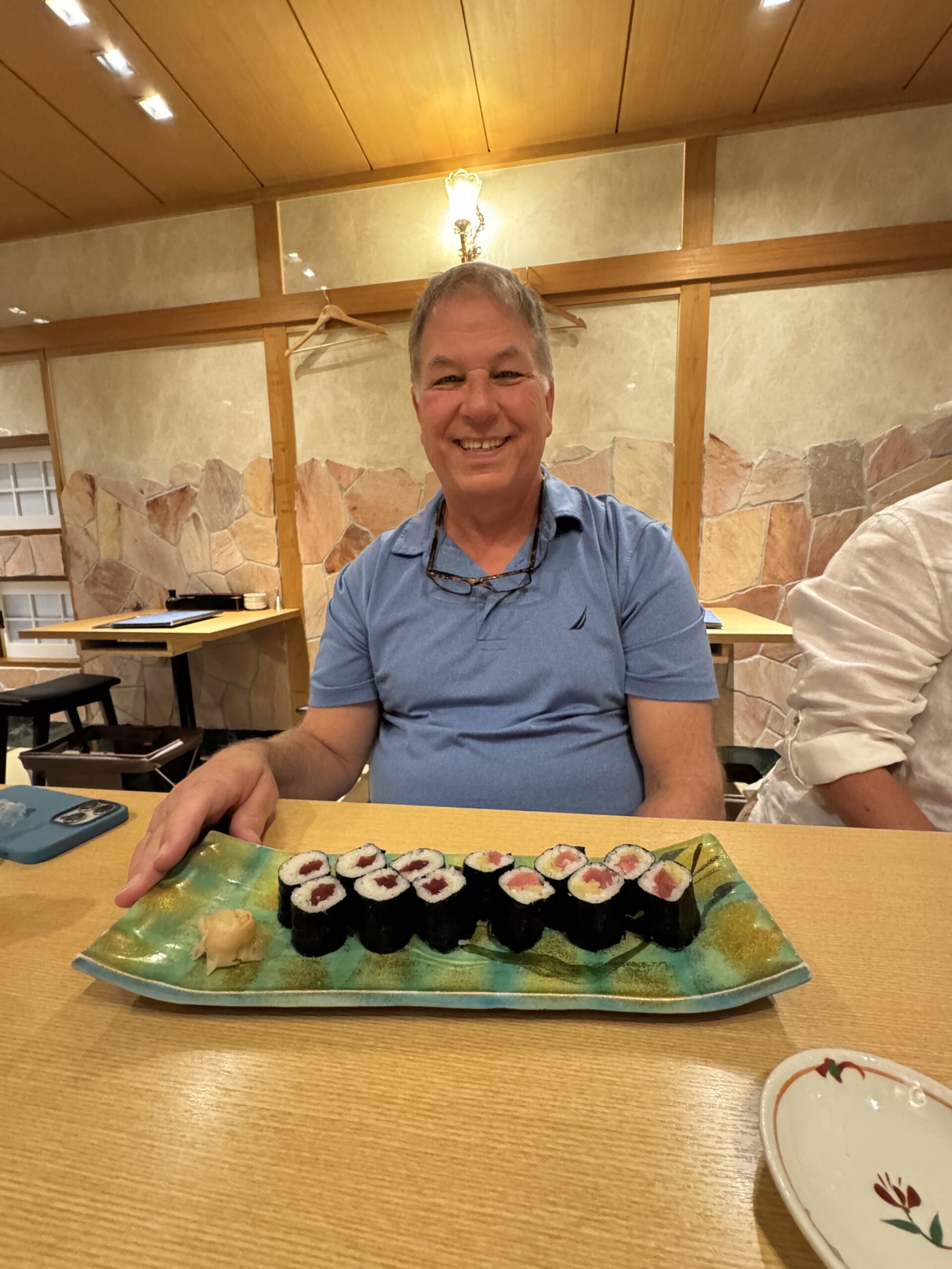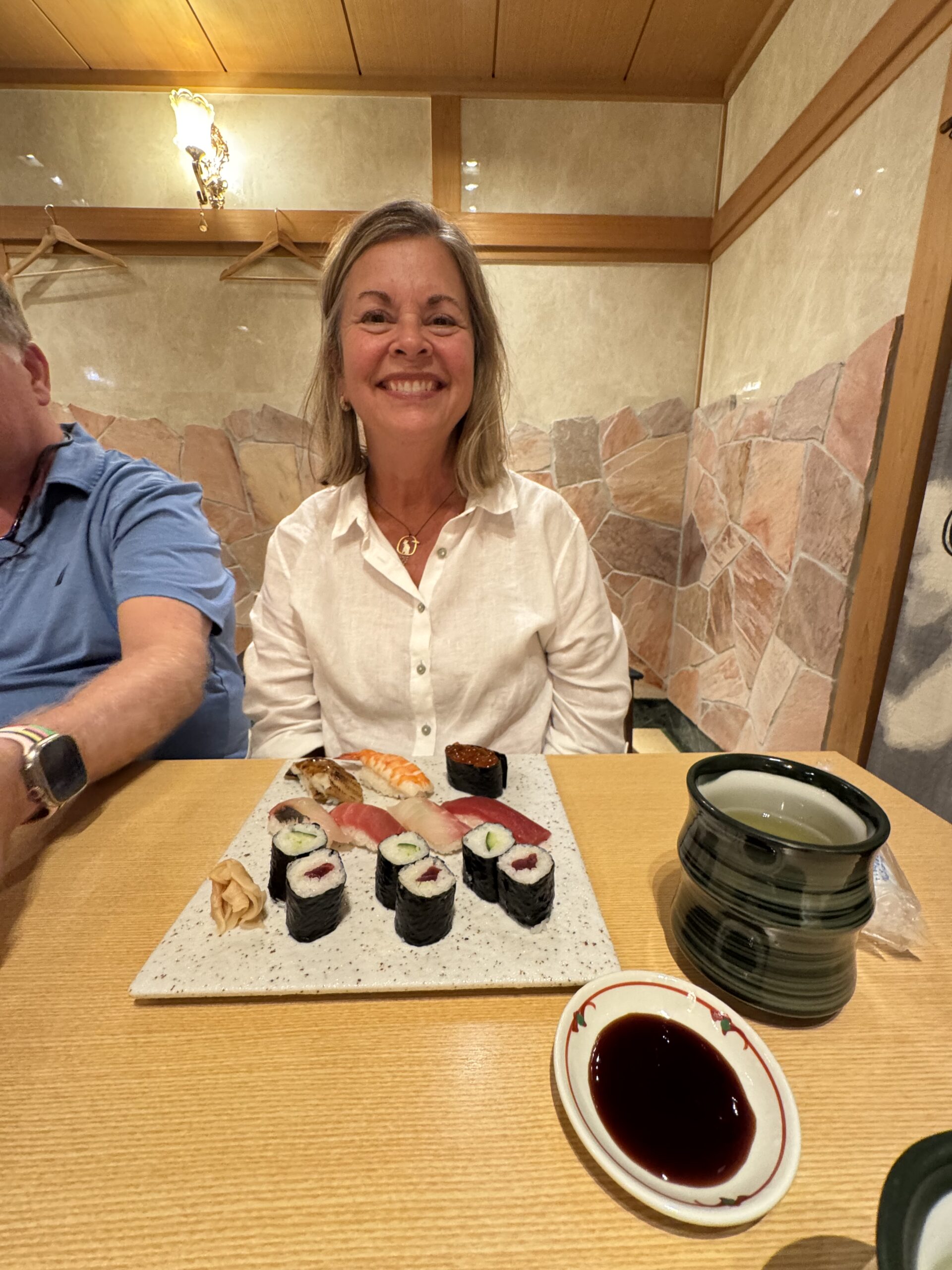 After our tour, we were dropped off at the S-Pulse Dream Plaza, a multi-floor shopping and dining complex right next to the ship. We enjoyed a late sushi lunch with Kathryn and Kevin and browsed the stores. On the way back to the ship, there was a small lovely craft market where Sharon purchased some origami earrings. People were getting their names written in Japanese and local dignitaries were saying goodbye before our 4pm departure.