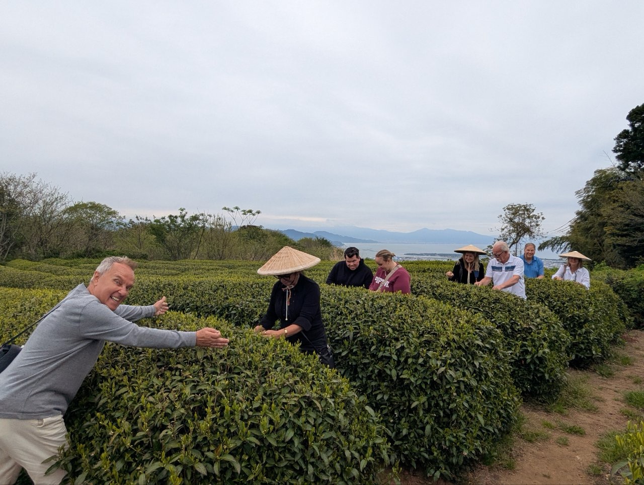 Nearby, there was a Mt Fuji observatory which we stopped at, and while there was still no observing of Fuji, there was a nice view of the harbor below. Our next stop was a green tea plantation, where we learned about harvesting the tea buds to make green tea. We enjoyed a sampling and purchased some high-quality tea.