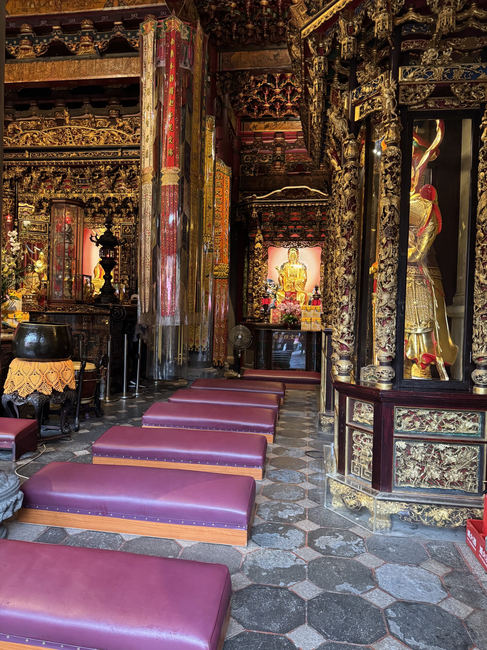 Today, our guide was Florence, a life-long resident of Taiwan. We were picked up at the cruise terminal and after a thirty-minute drive to Taipei, our first stop was the Lungshan Temple. If you’ve been following the blog, you know we’ve seen a temple or two over the last couple of months. This one had to be in top five – for beauty, for authenticity and for its scent. If we could add scratch and sniff to this blog, we would!! The burning incense, combined with the scent of thousands of fresh flowers, suffice it to say that it was intoxicating. Along with the fresh cut flower arrangements, there were also live orchid plants, each with a card that told the personal prayer of the person giving it. There were gifts of food, cakes, and fruit. It was an amazing vibe and a wonderful thing to witness.