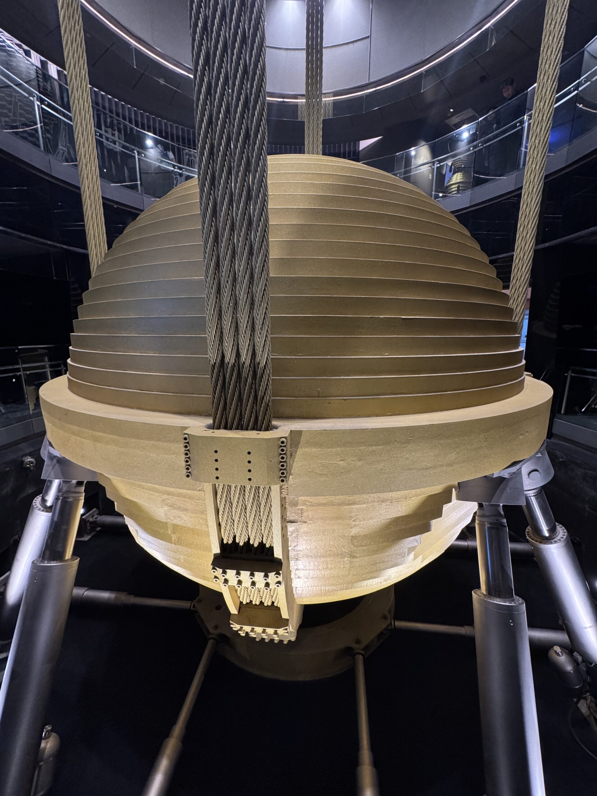 This damper, weighing 1.4 million pounds, controls the amount of sway of the building, during high winds and earthquakes.