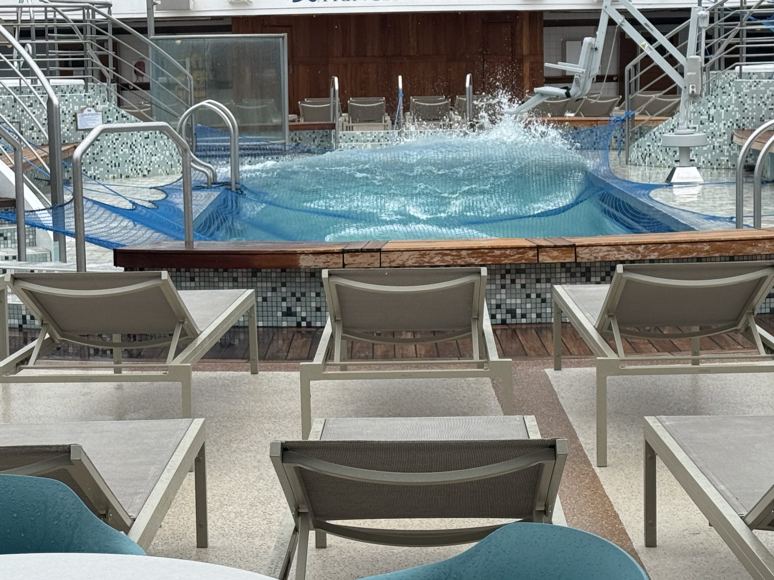 Both pools have been closed since the crossing began. They're too violent for swimming. In fact, the inside pool has been completely drained to keep water out of the atrium.