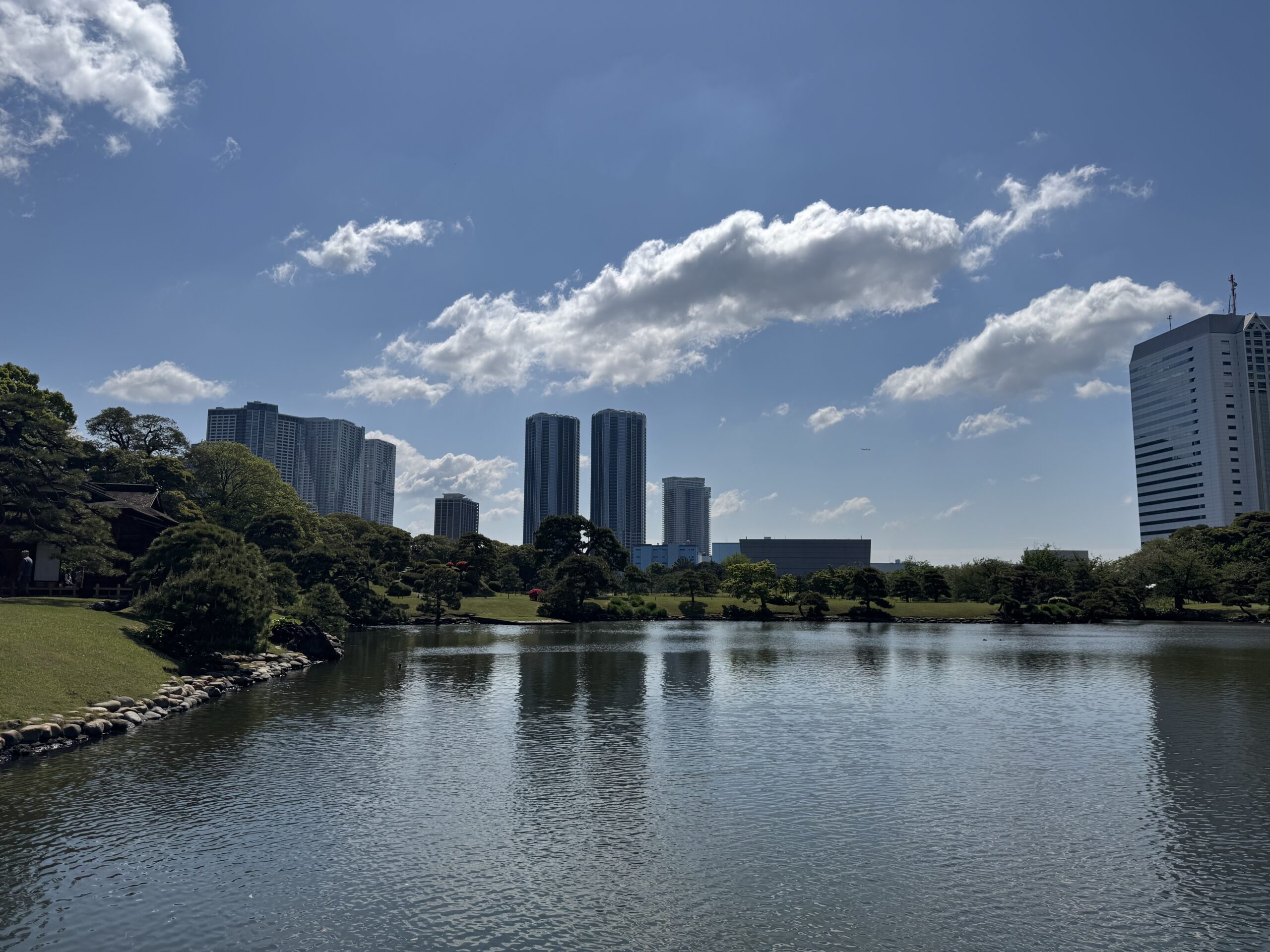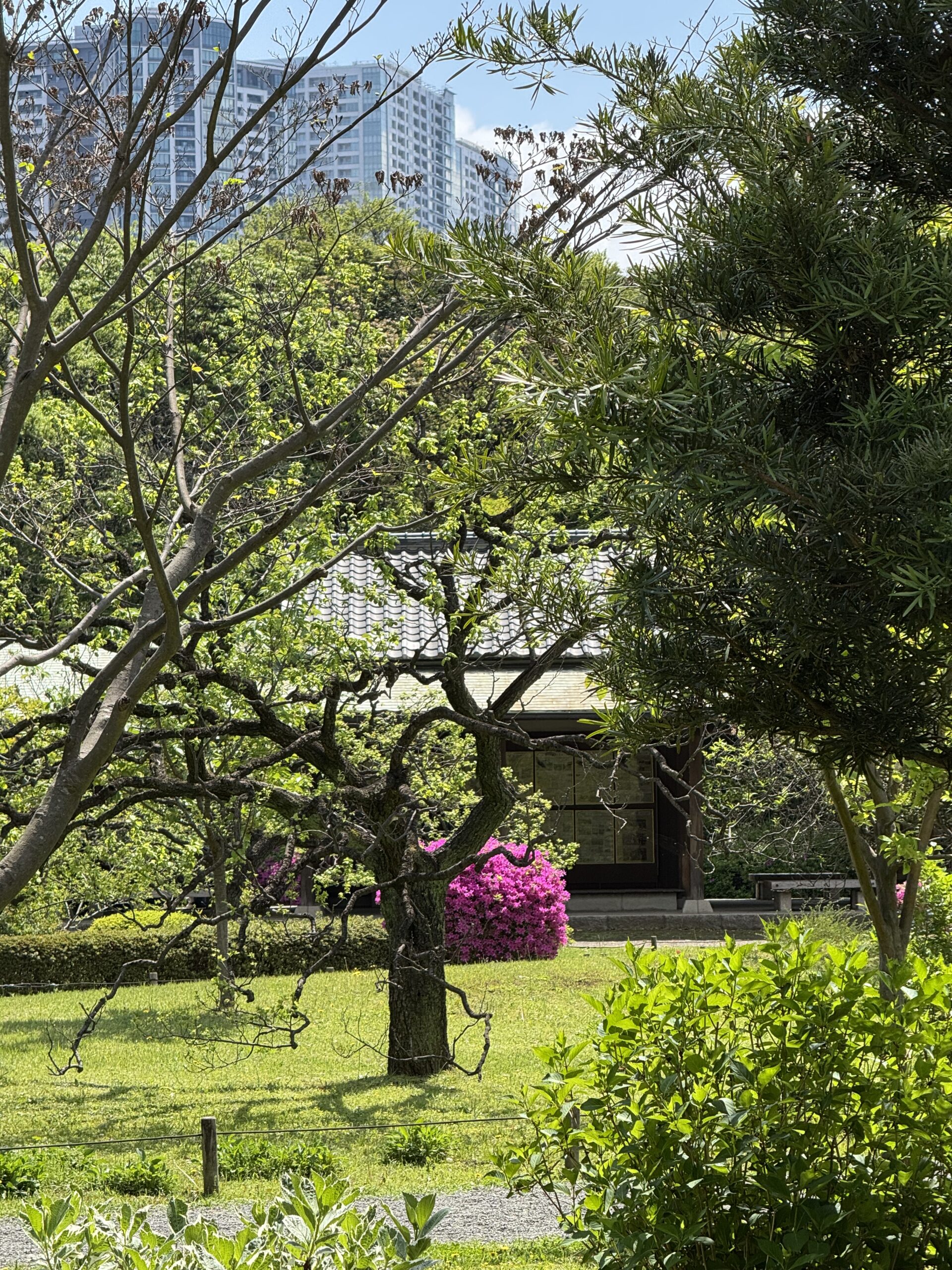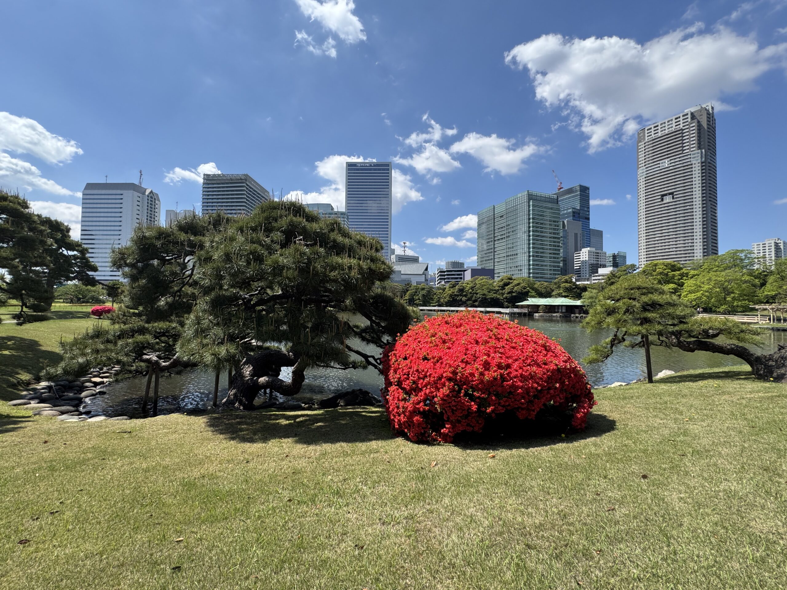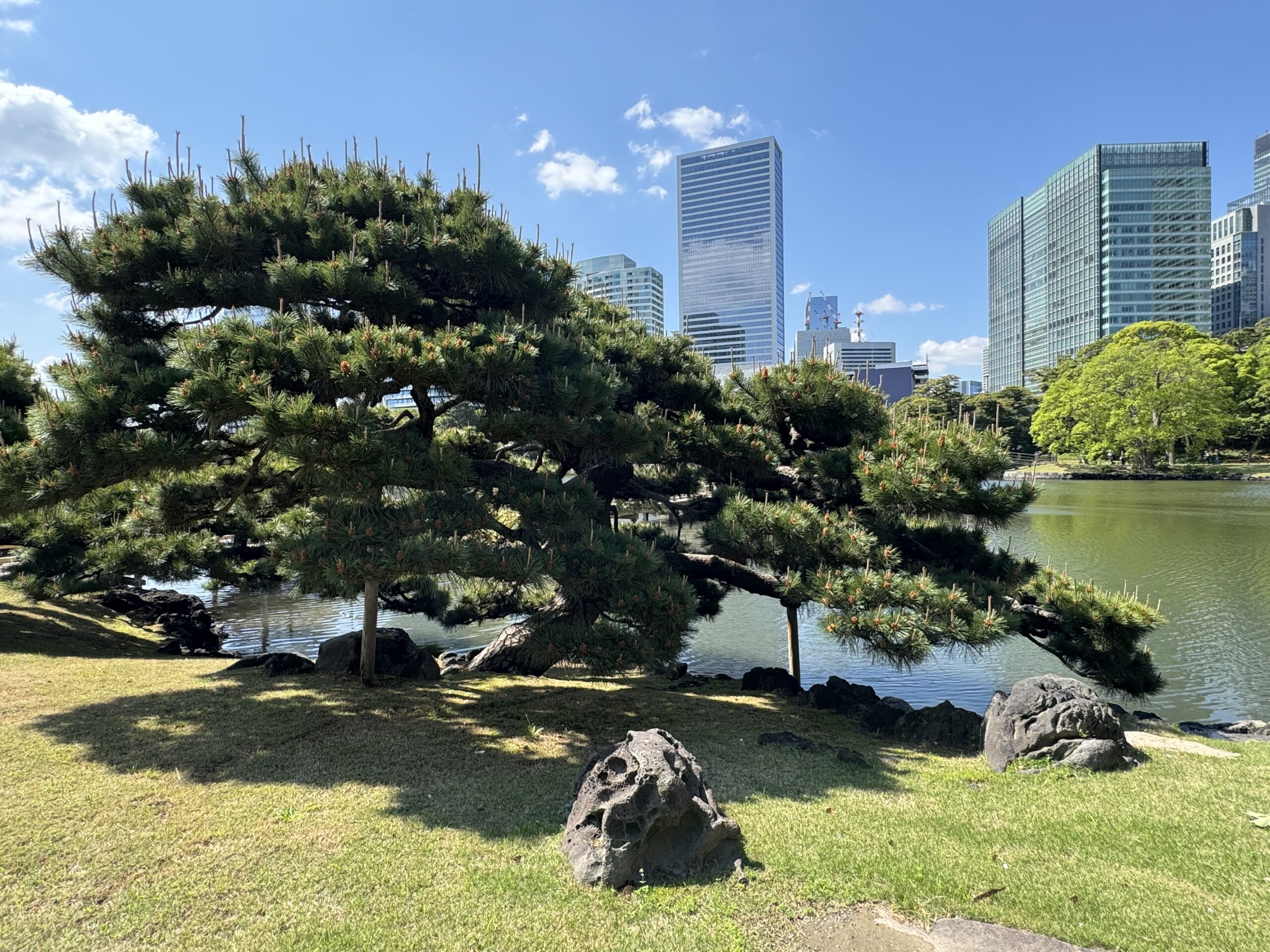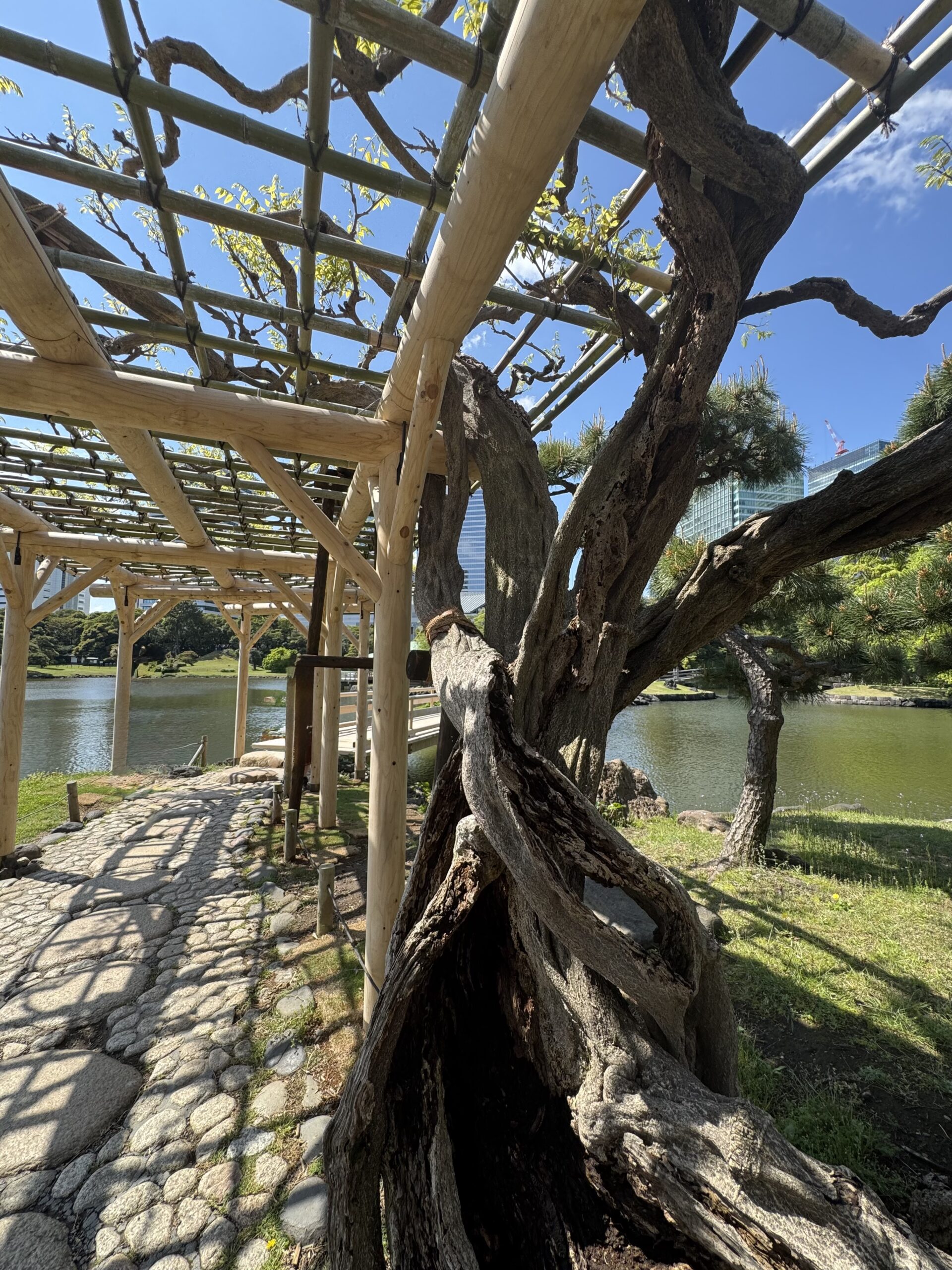 We met our guide, Noripy, at the Hamarikyu Gardens, and enjoyed walking the grounds. Originally the land was used by generations of shogun as a secondary residence, and from the time of Tokugawa Ienari through Tokugawa Ieyoshi, it was a place where the shogun could indulge in falconry. A landscaped garden of 62 acres includes a Shioiri-no-ike (Tidal Pond), and the garden is surrounded by a seawater moat filled by Tokyo Bay. As the tide rises and falls, so does the level of water in the pond. At the center of the pond is a teahouse, reached by two bridges, where we enjoyed matcha and Japanese sweets, in a tea-ceremony style.