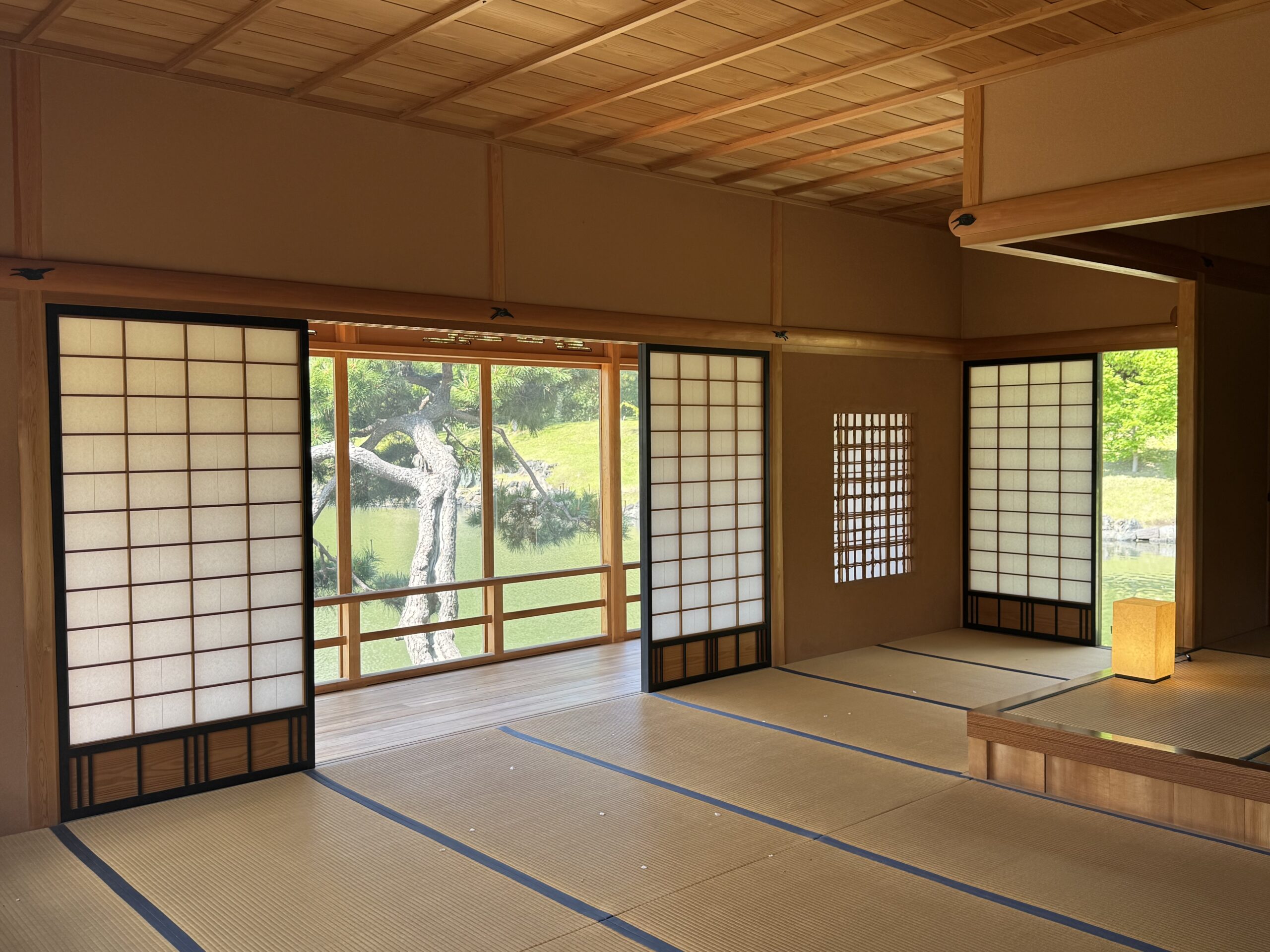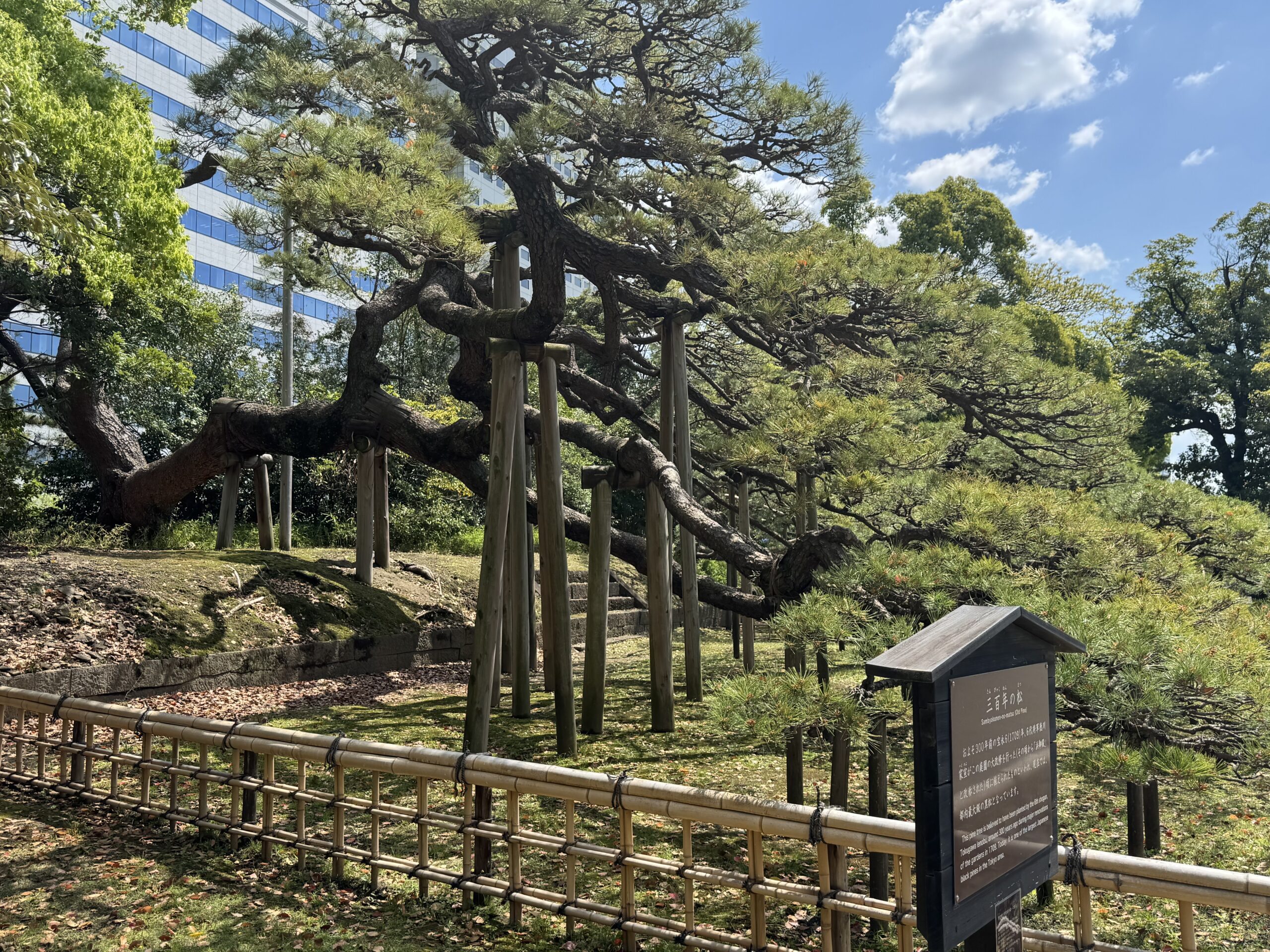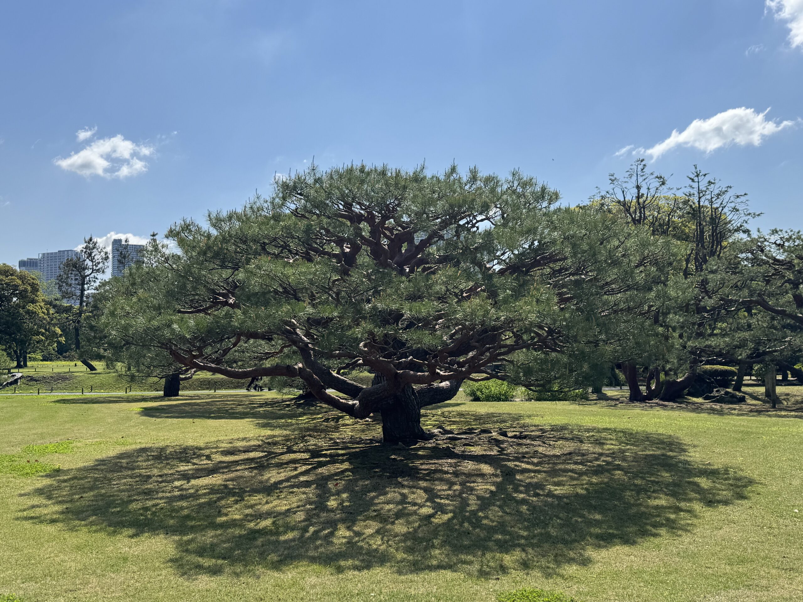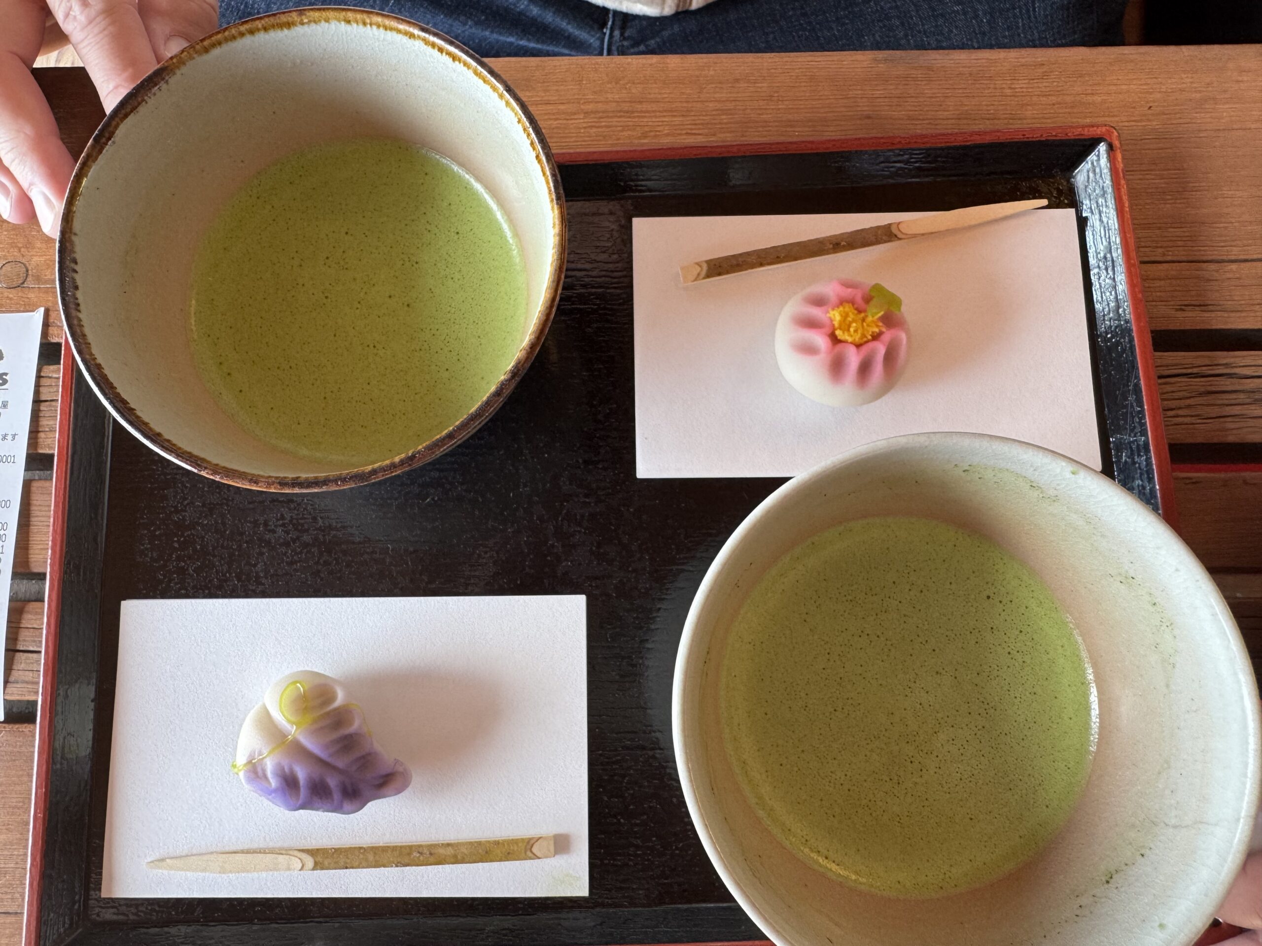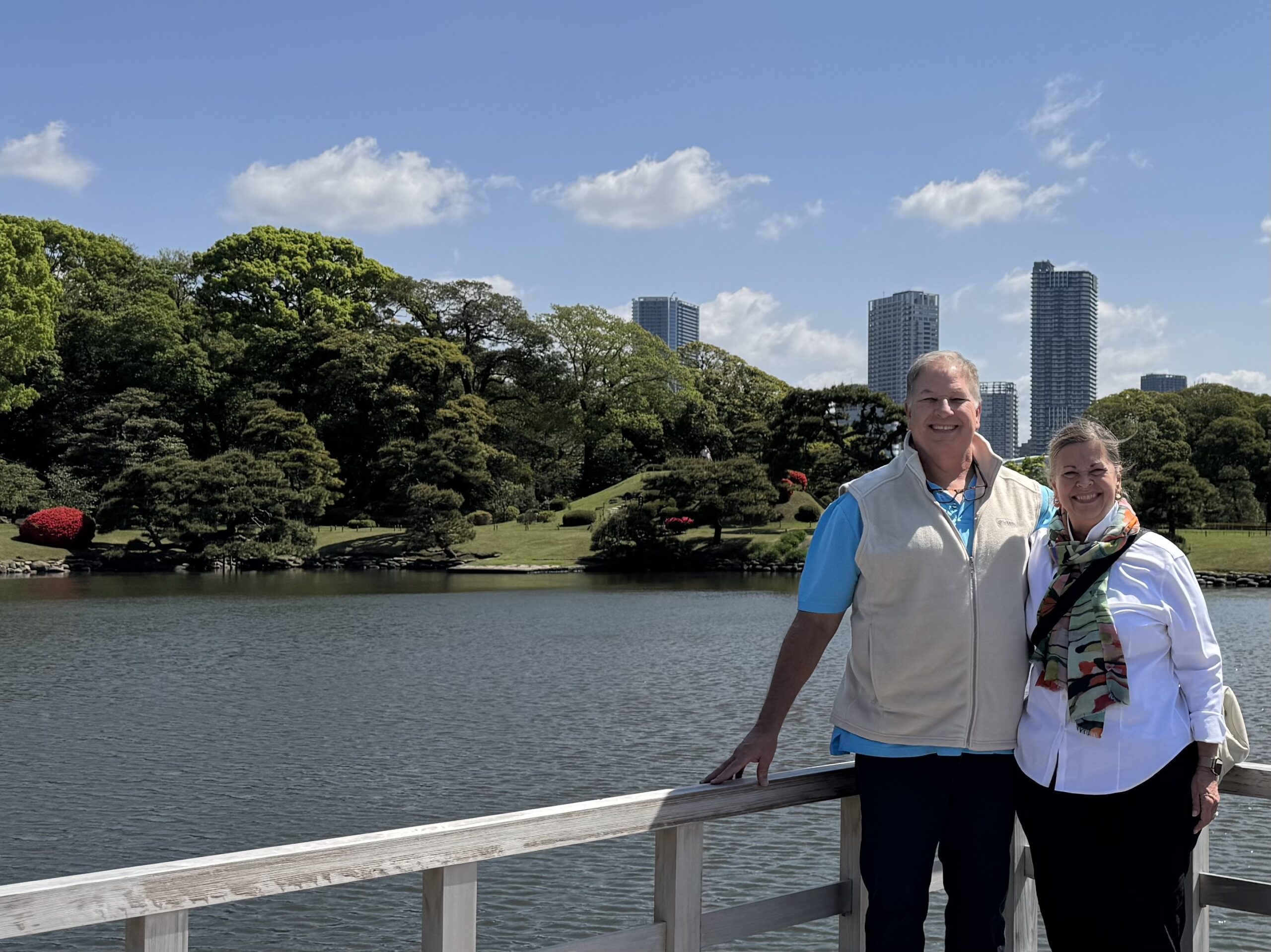 We met our guide, Noripy, at the Hamarikyu Gardens, and enjoyed walking the grounds. Originally the land was used by generations of shogun as a secondary residence, and from the time of Tokugawa Ienari through Tokugawa Ieyoshi, it was a place where the shogun could indulge in falconry. A landscaped garden of 62 acres includes a Shioiri-no-ike (Tidal Pond), and the garden is surrounded by a seawater moat filled by Tokyo Bay. As the tide rises and falls, so does the level of water in the pond. At the center of the pond is a teahouse, reached by two bridges, where we enjoyed matcha and Japanese sweets, in a tea-ceremony style.